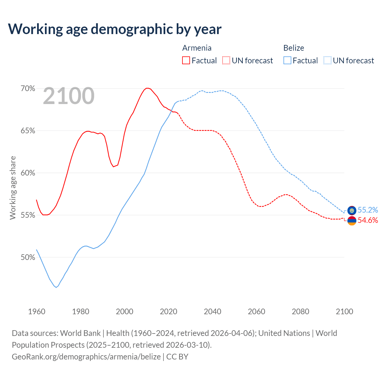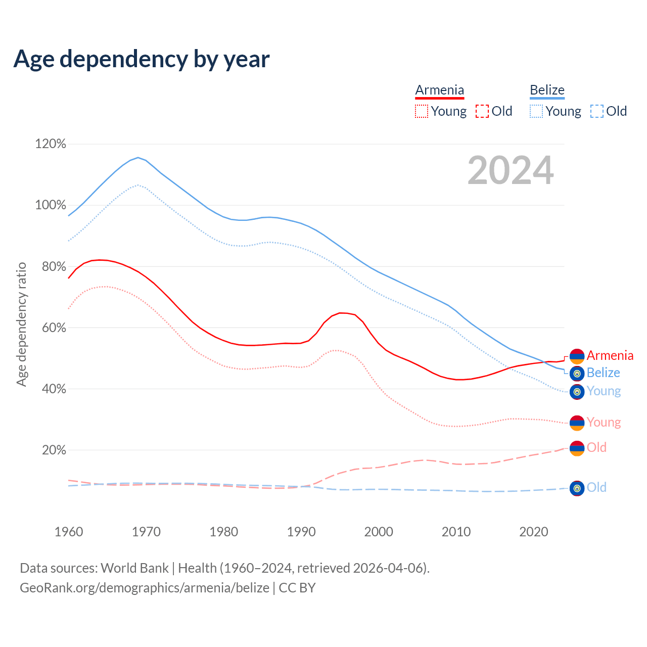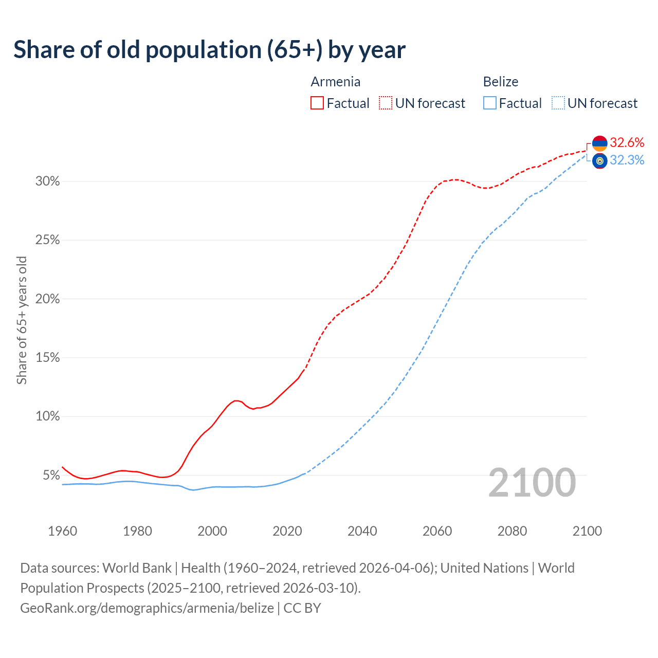 - The share of old-age demographic (65+) in Armenia is 13.7% vs 5.02% in Belize.