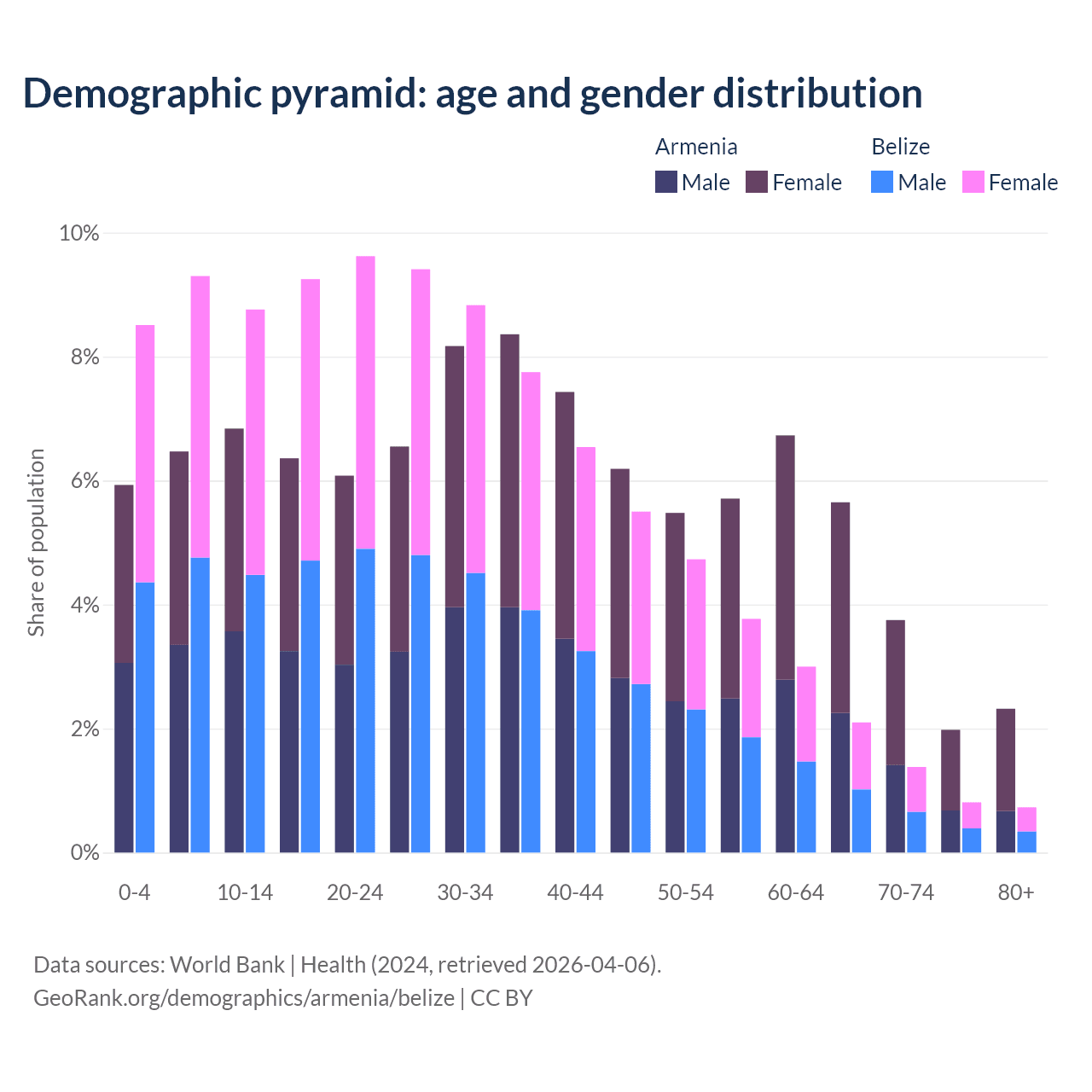 The share of older people aged 65 and over is 13.7% in Armenia and 5.02% in Belize. Life expectancy in Armenia compared to Belize .