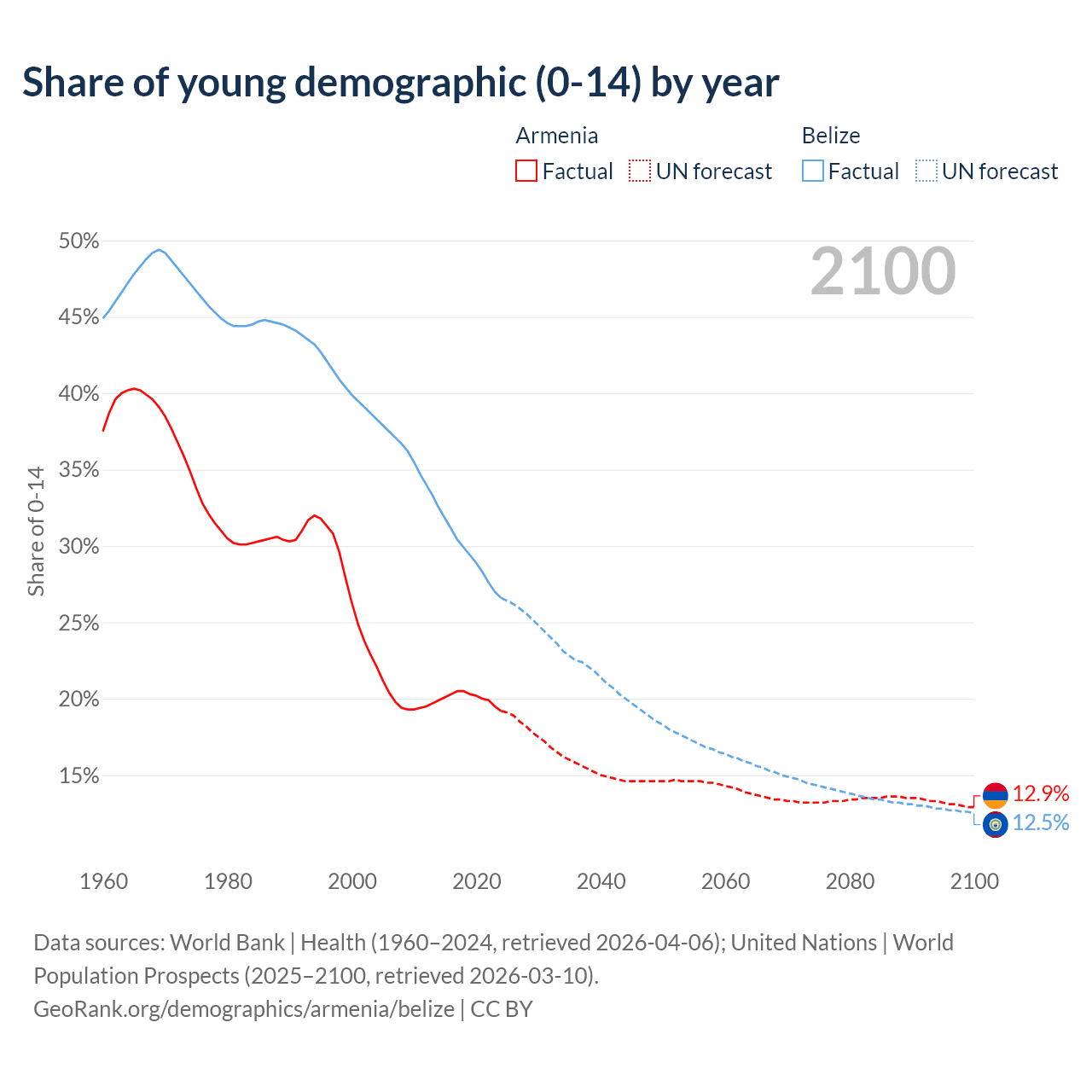 - The share of young demographic (0-15 years old) in Armenia is 19.2% vs 26.6% in Belize.