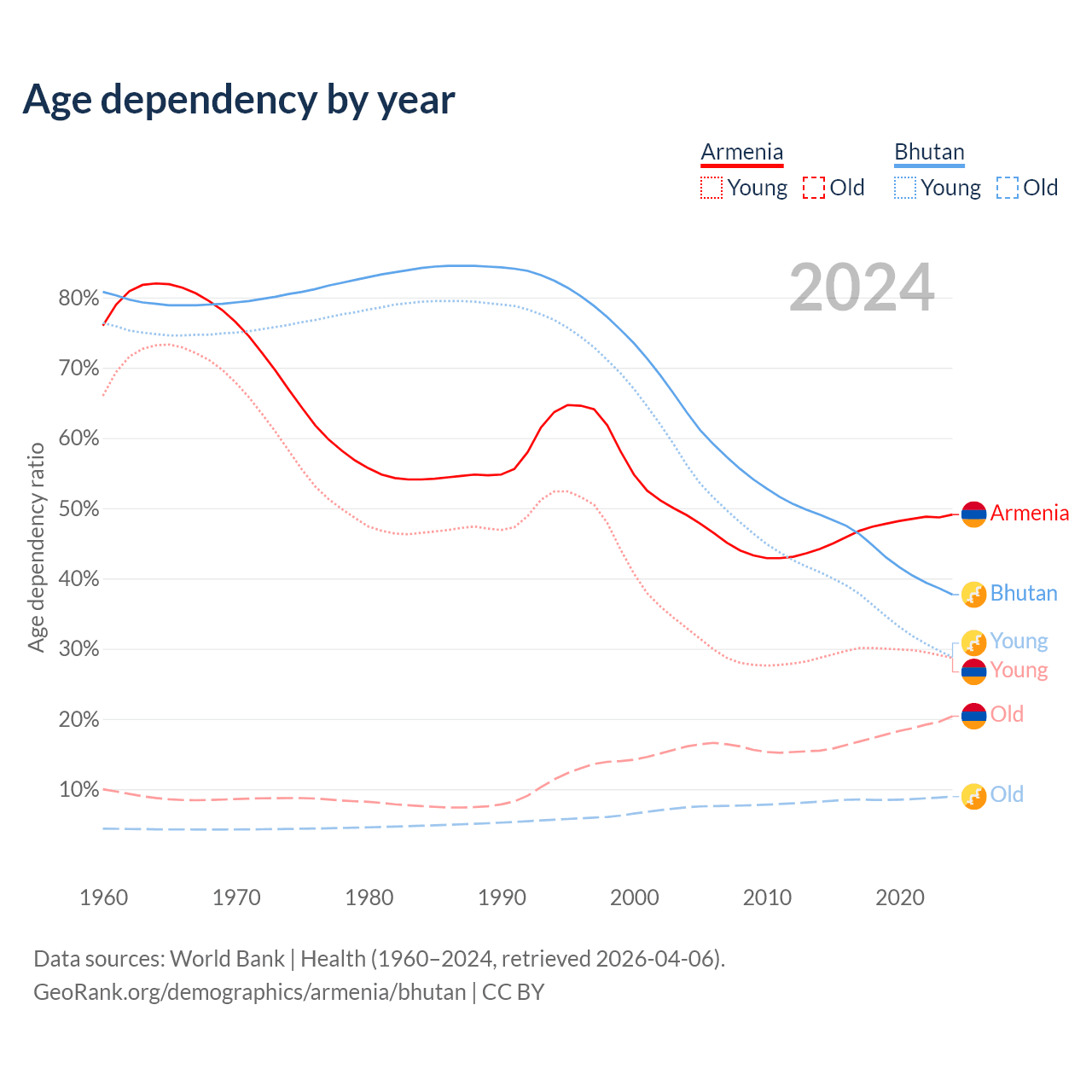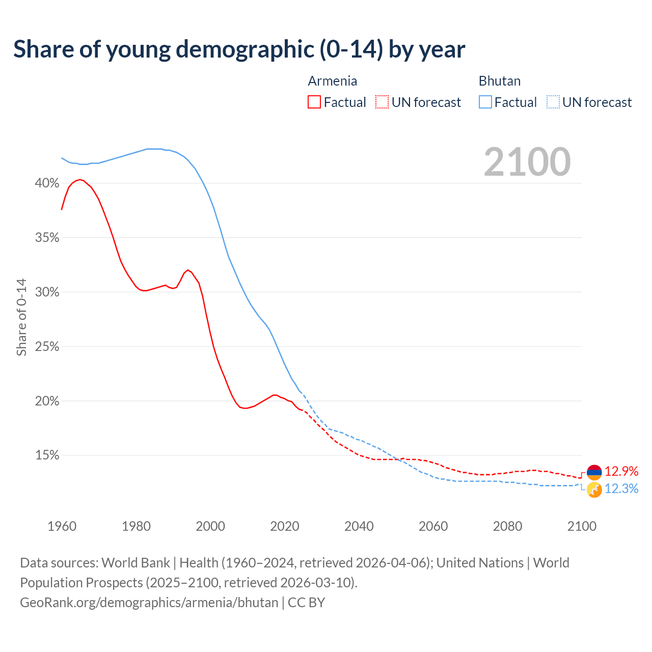 - The share of young demographic (0-15 years old) in Armenia is 19.2% vs 20.9% in Bhutan.