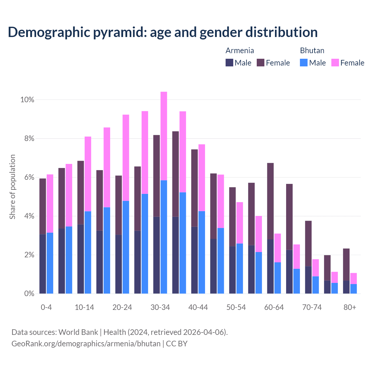 - As of 2026, the population of Armenia is 2.99M vs 803K in Bhutan - 3.72 times difference.