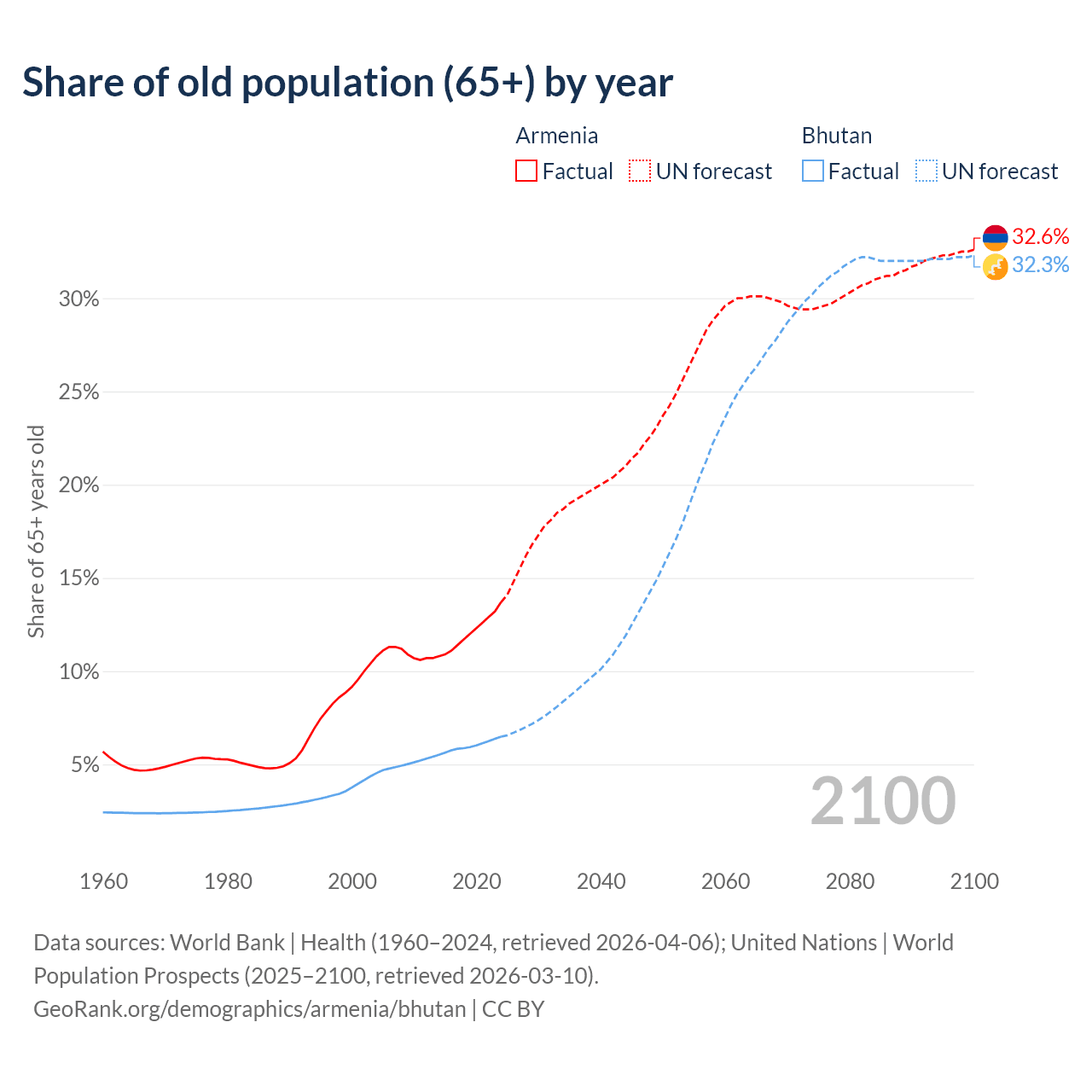 - The share of old-age demographic (65+) in Armenia is 13.7% vs 6.49% in Bhutan.
