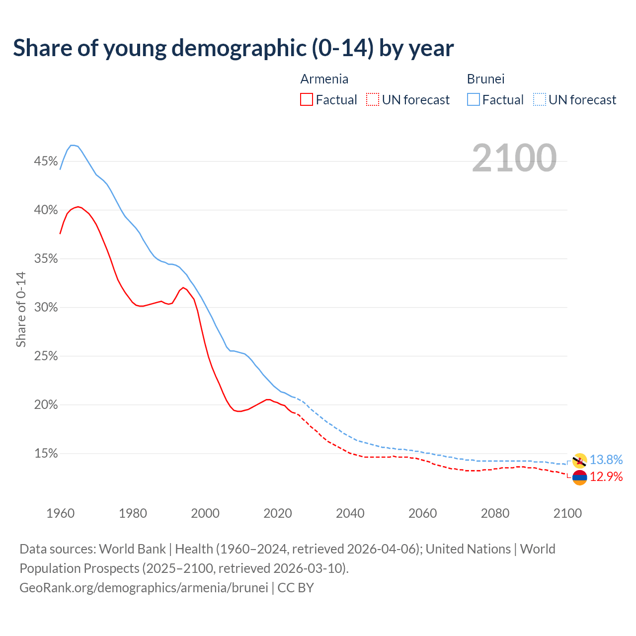- The share of young demographic (0-15 years old) in Armenia is 19.2% vs 20.8% in Brunei.