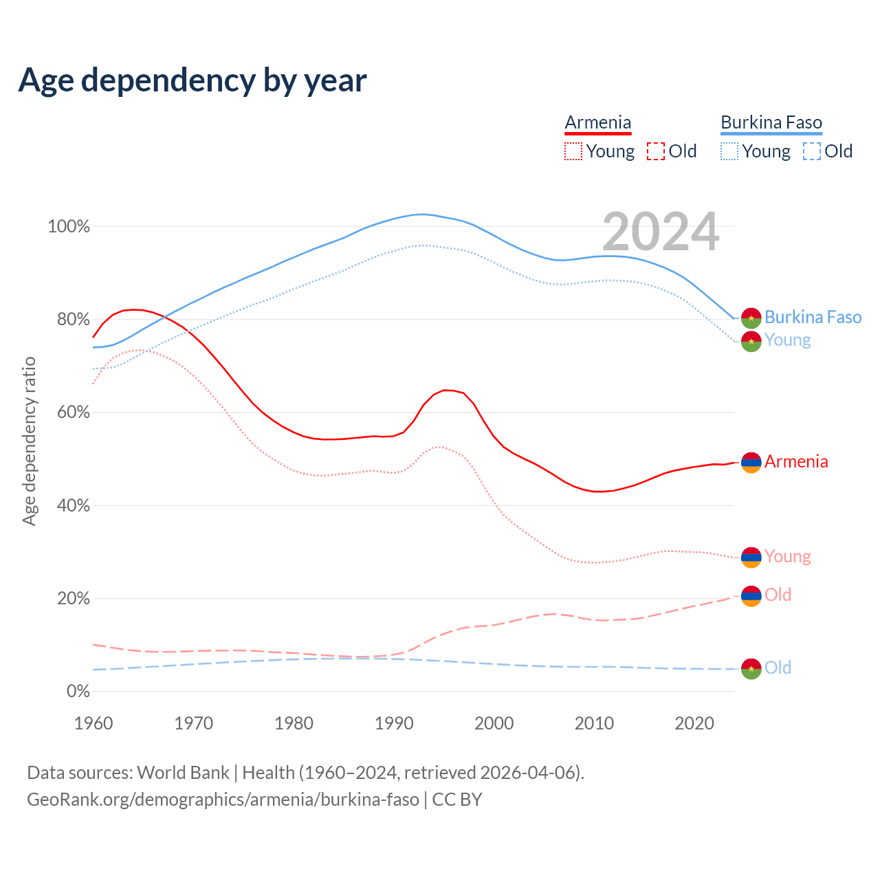 - The share of old-age demographic (65+) in Armenia is 13.7% vs 2.65% in Burkina Faso.