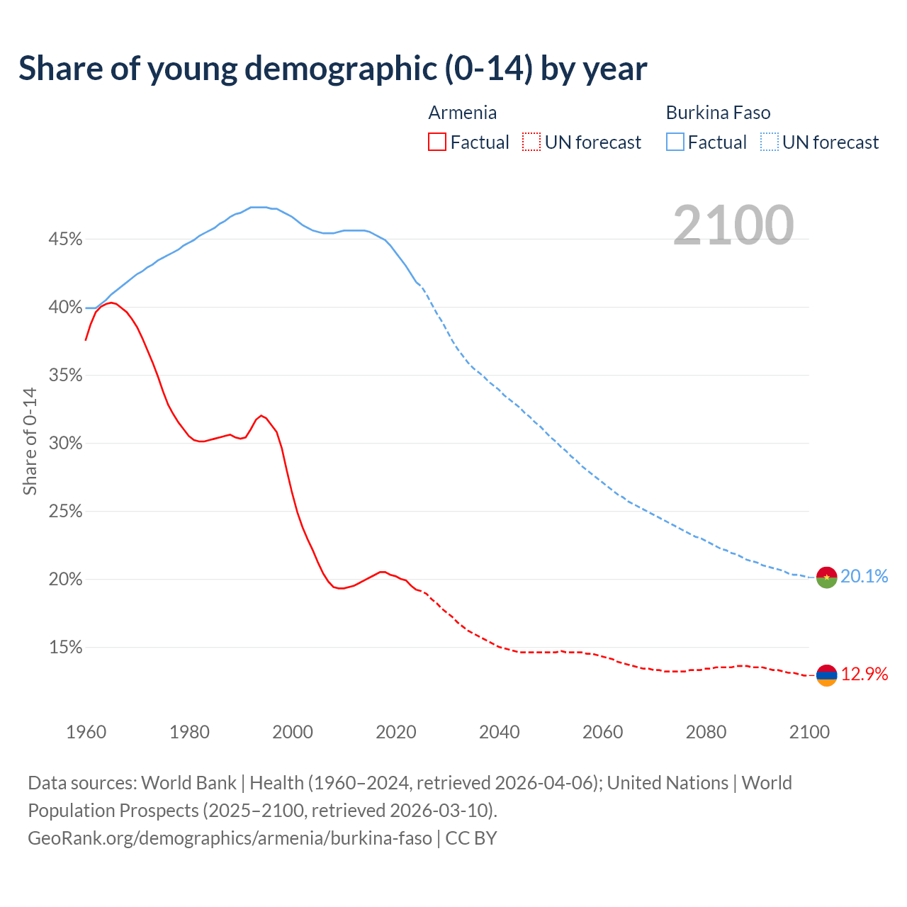 - The share of young demographic (0-15 years old) in Armenia is 19.2% vs 41.8% in Burkina Faso.