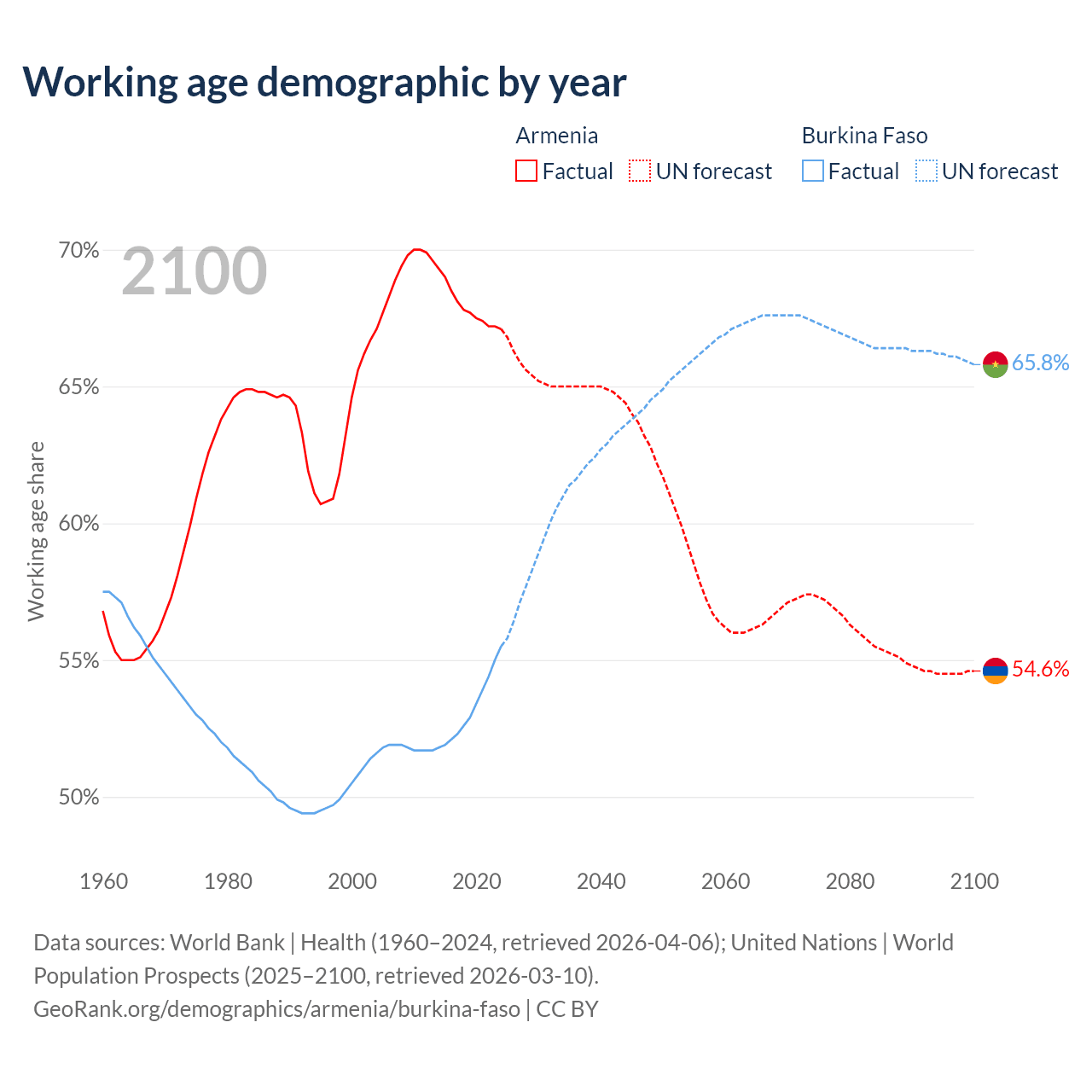 The share of older people aged 65 and over is 13.7% in Armenia and 2.65% in Burkina Faso. Life expectancy in Armenia compared to Burkina Faso .