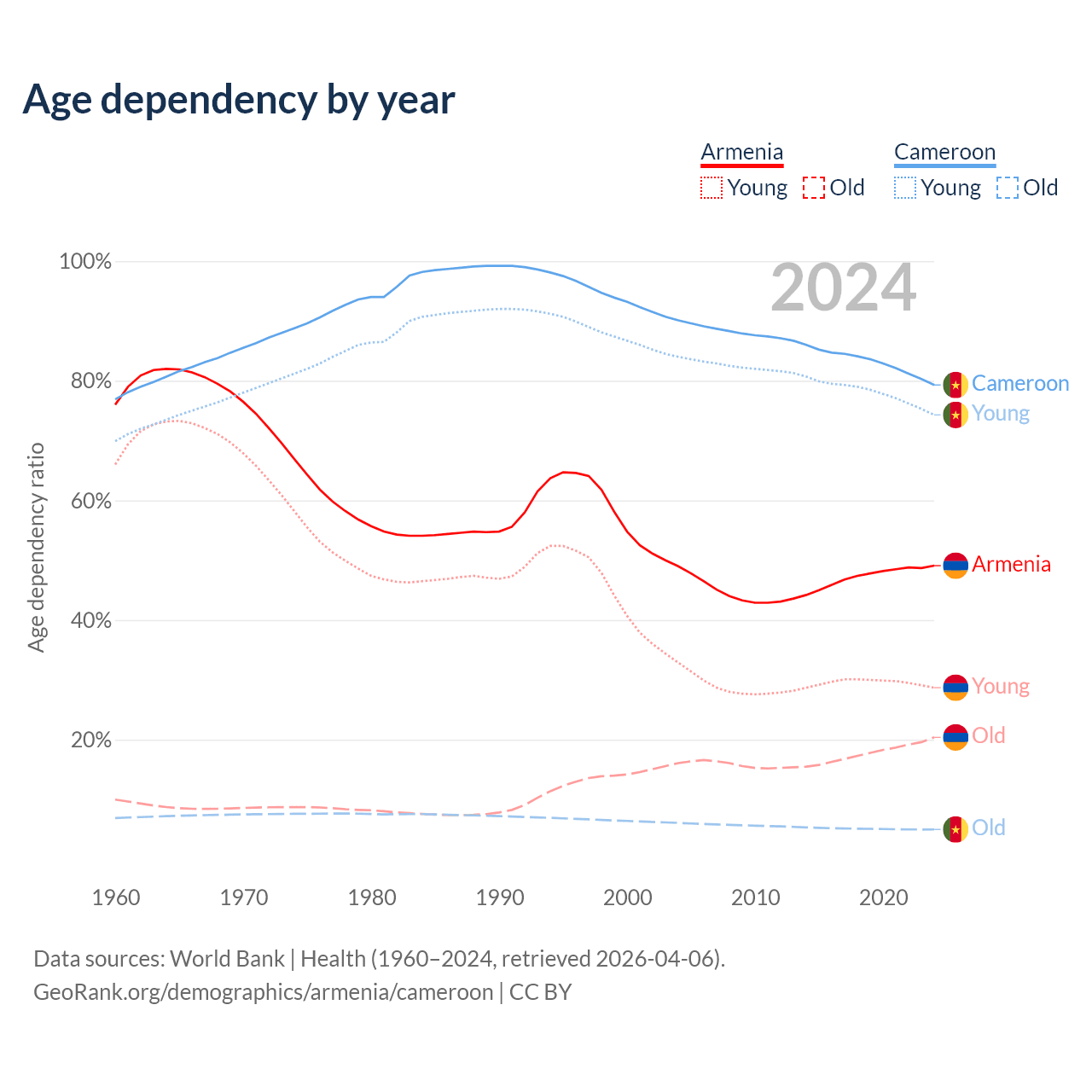 The share of older people aged 65 and over is 13.7% in Armenia and 2.79% in Cameroon. Life expectancy in Armenia compared to Cameroon .