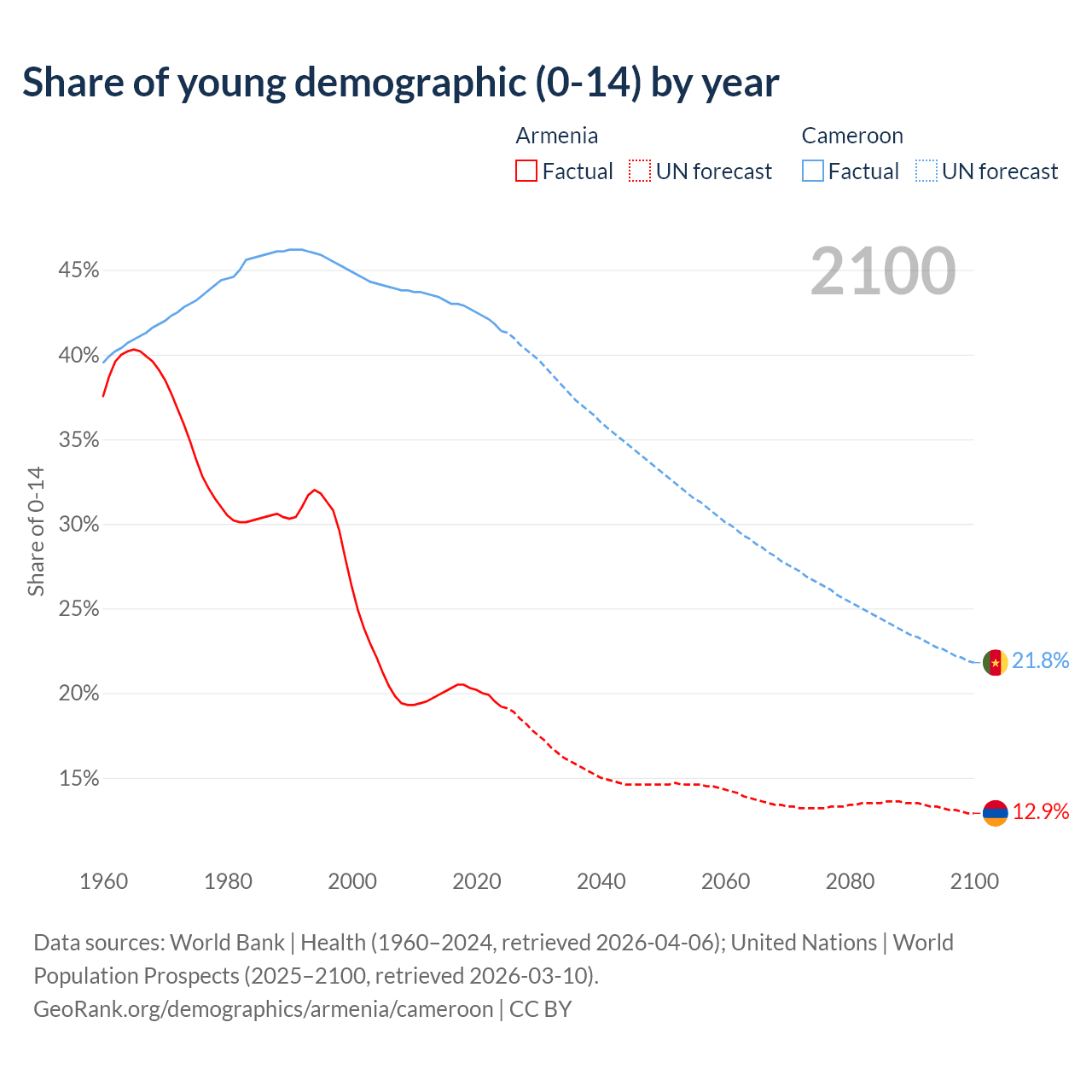 - The share of young demographic (0-15 years old) in Armenia is 19.2% vs 41.4% in Cameroon.