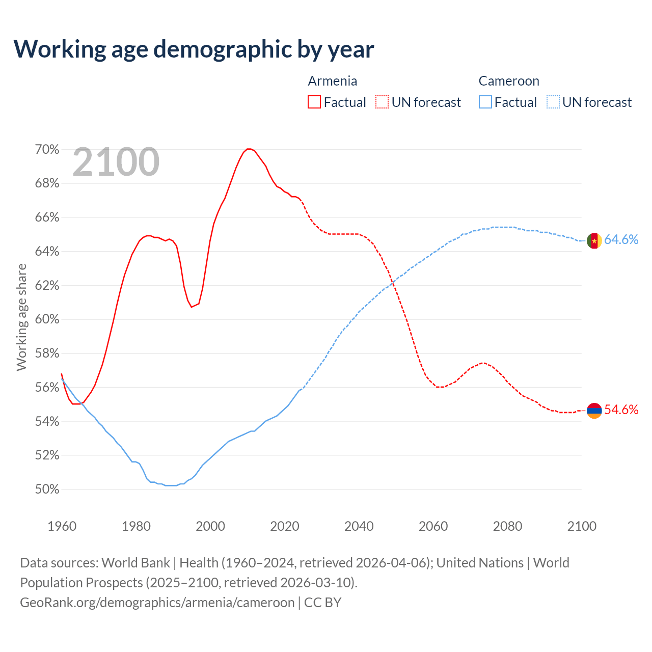- Armenia has 2M working age adults (aged 15-64) vs 17.2M in Cameroon.