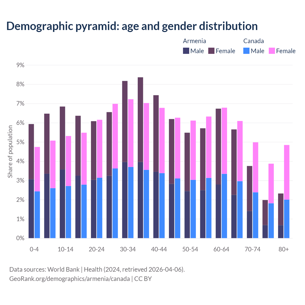 - Armenia is ranked 64/196 by median age (oldest to youngest) vs 38/196 for Canada.