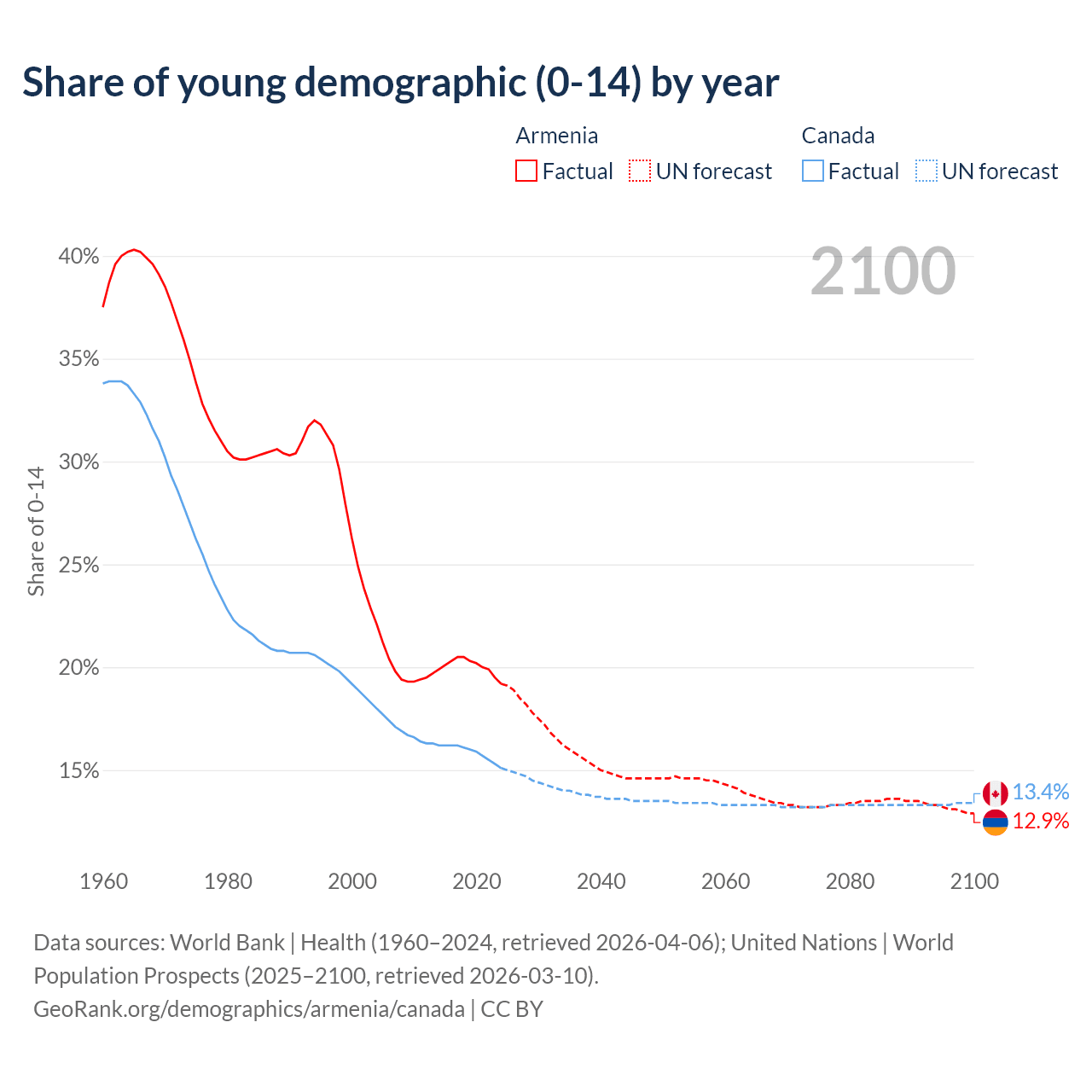 - The share of young demographic (0-15 years old) in Armenia is 19.2% vs 15.1% in Canada.