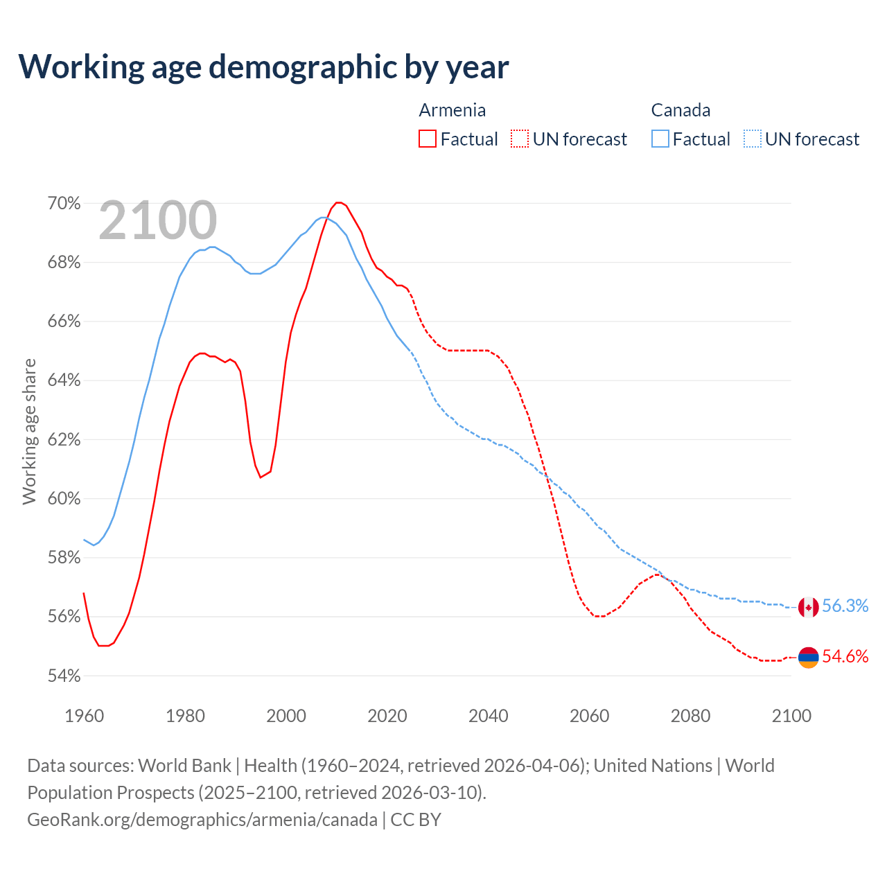 - Armenia has 2M working age adults (aged 15-64) vs 27.5M in Canada.