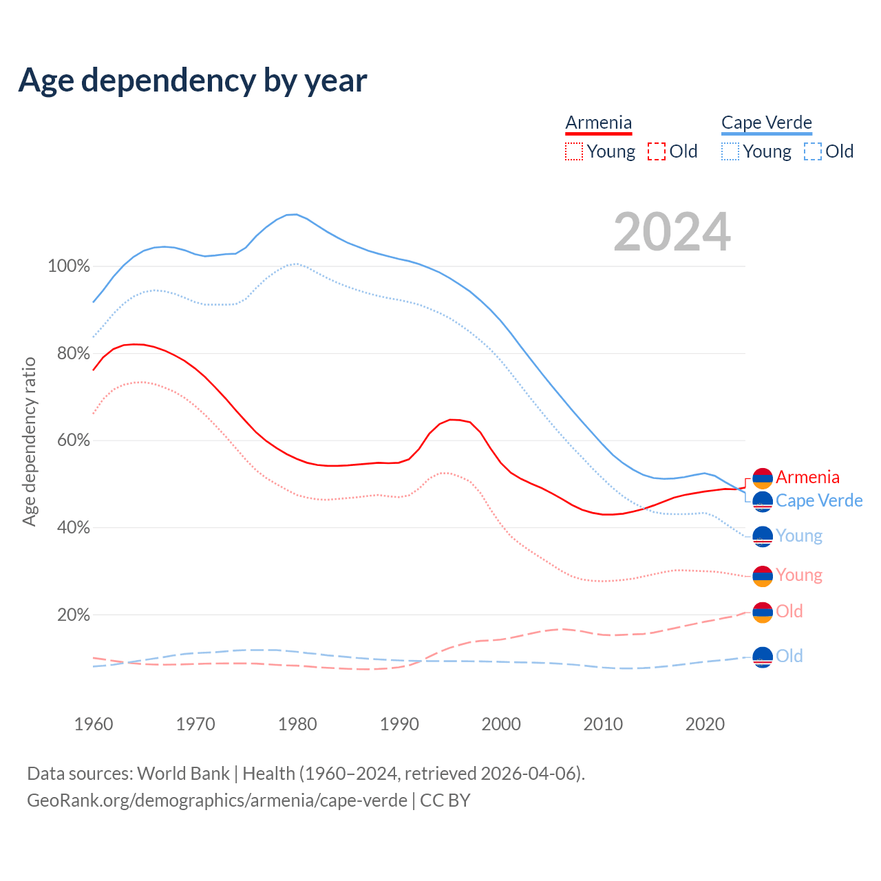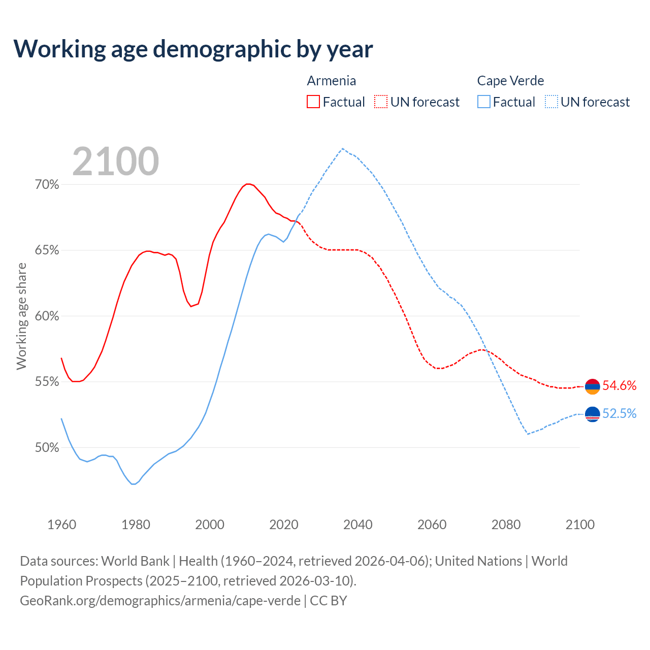 - The share of old-age demographic (65+) in Armenia is 13.7% vs 6.86% in Cape Verde.