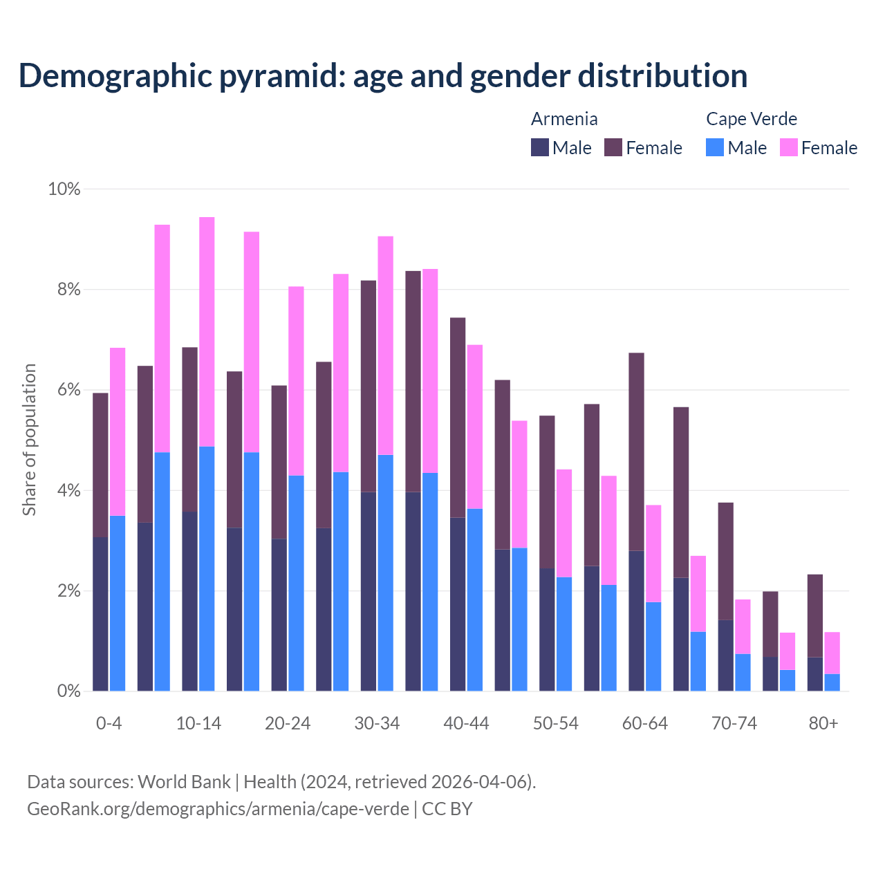 - Armenia is ranked 64/196 by median age (oldest to youngest) vs 110/196 for Cape Verde.