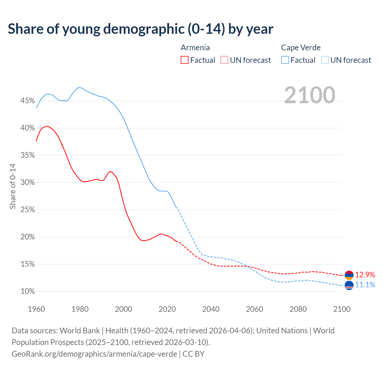 - The share of young demographic (0-15 years old) in Armenia is 19.2% vs 25.5% in Cape Verde.