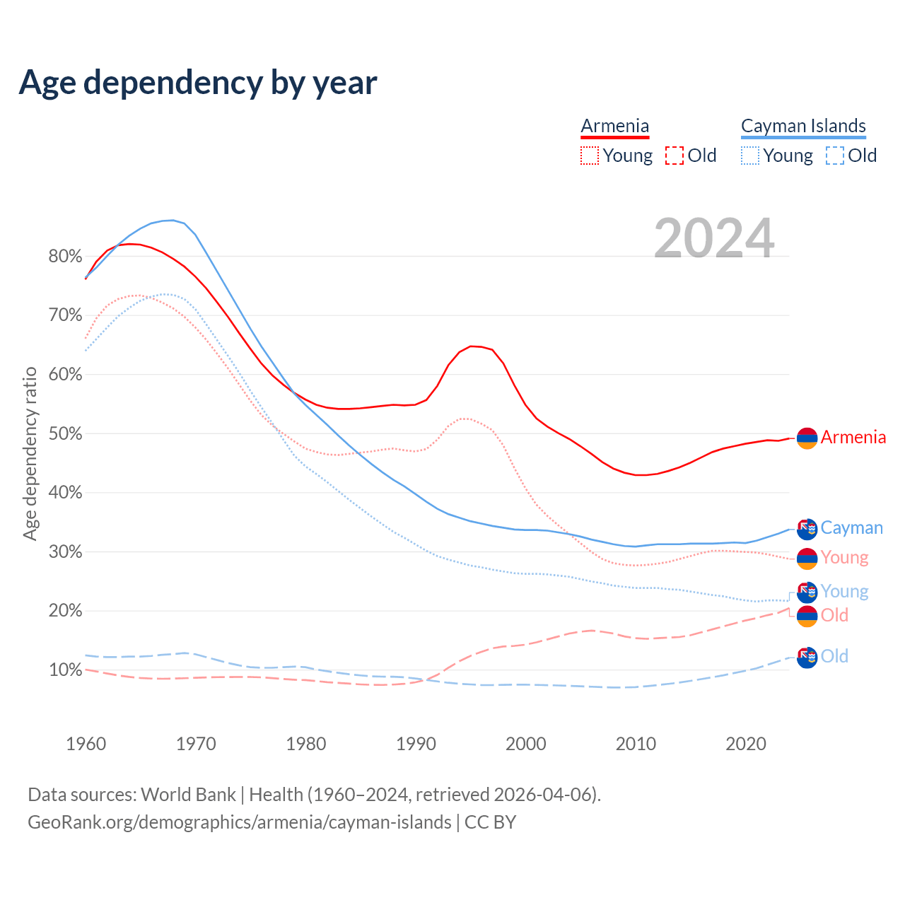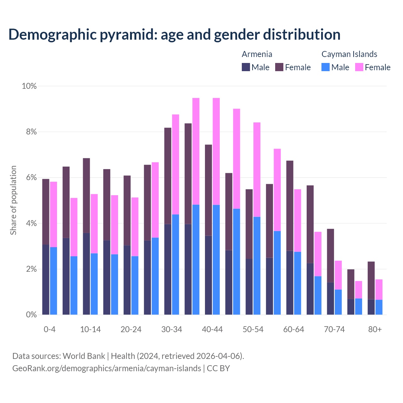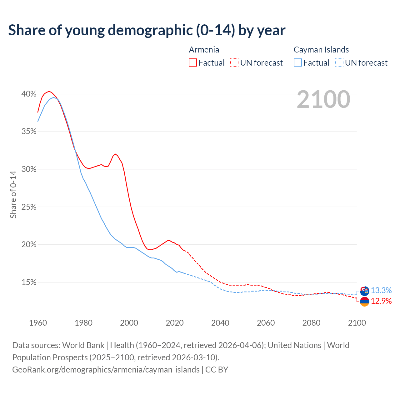 - The share of young demographic (0-15 years old) in Armenia is 19.2% vs 16.2% in the Cayman Islands.