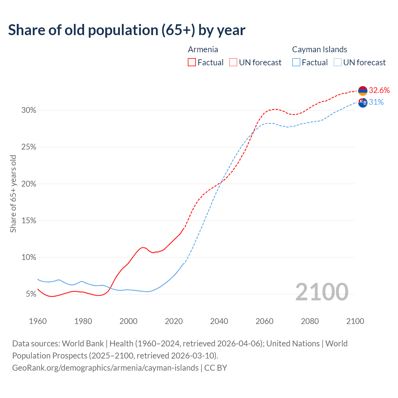 The share of older people aged 65 and over is 13.7% in Armenia and 9% in the Cayman Islands. Life expectancy in Armenia compared to the Cayman Islands .