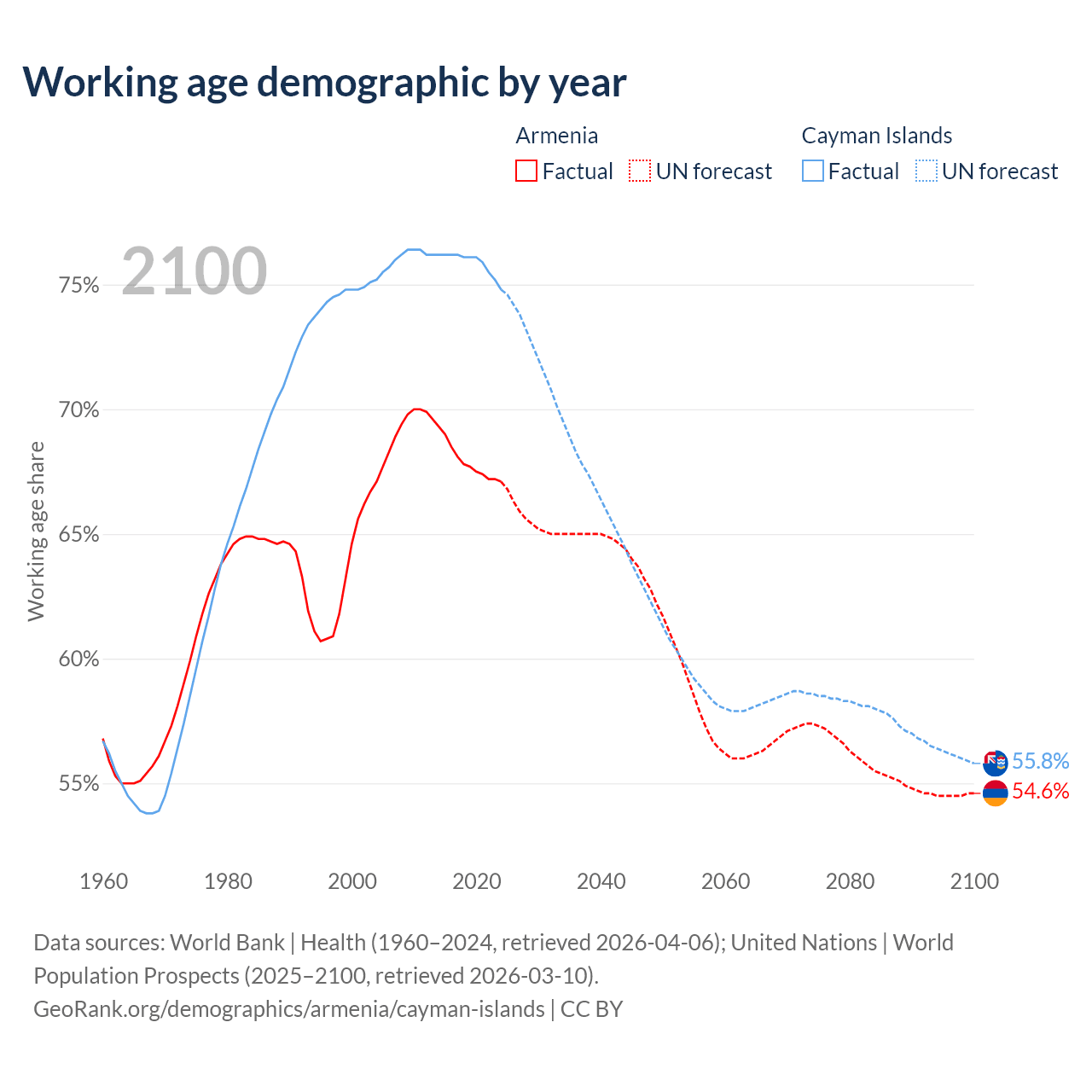 Median age Armenia vs Cayman Islands, 1960-2100
