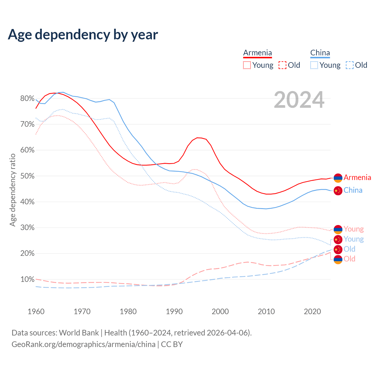 - Armenia is ranked 64/196 by median age (oldest to youngest) vs 44/196 for China.