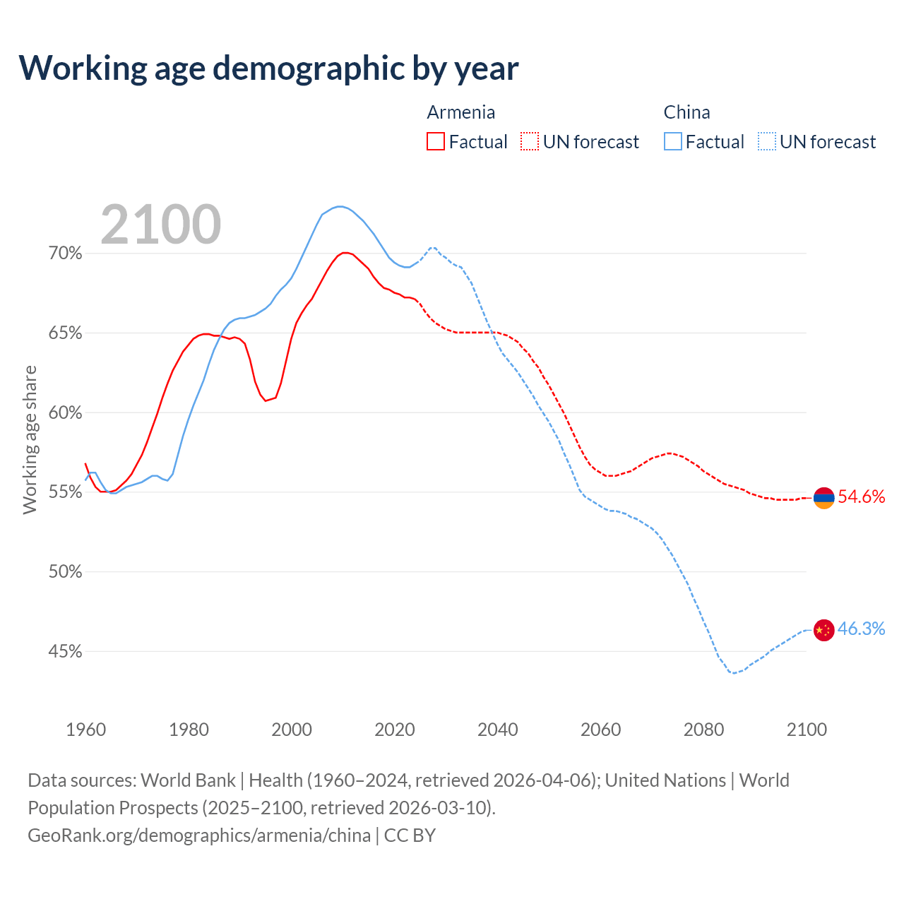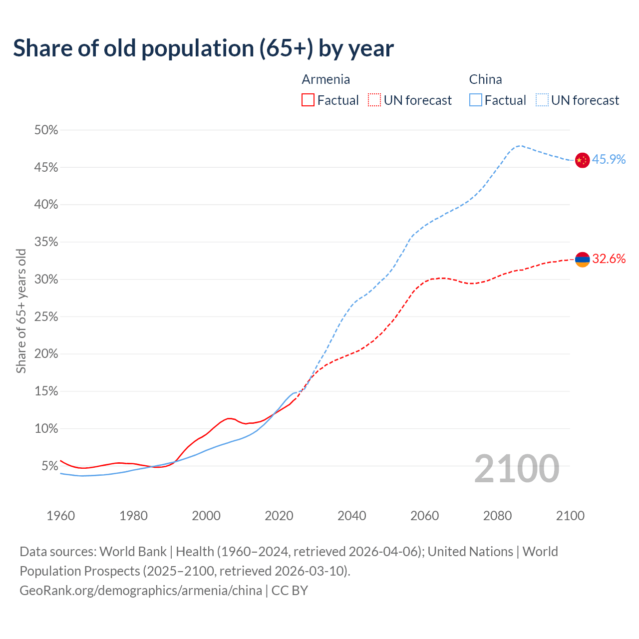 Median age Armenia vs China, 1960-2100