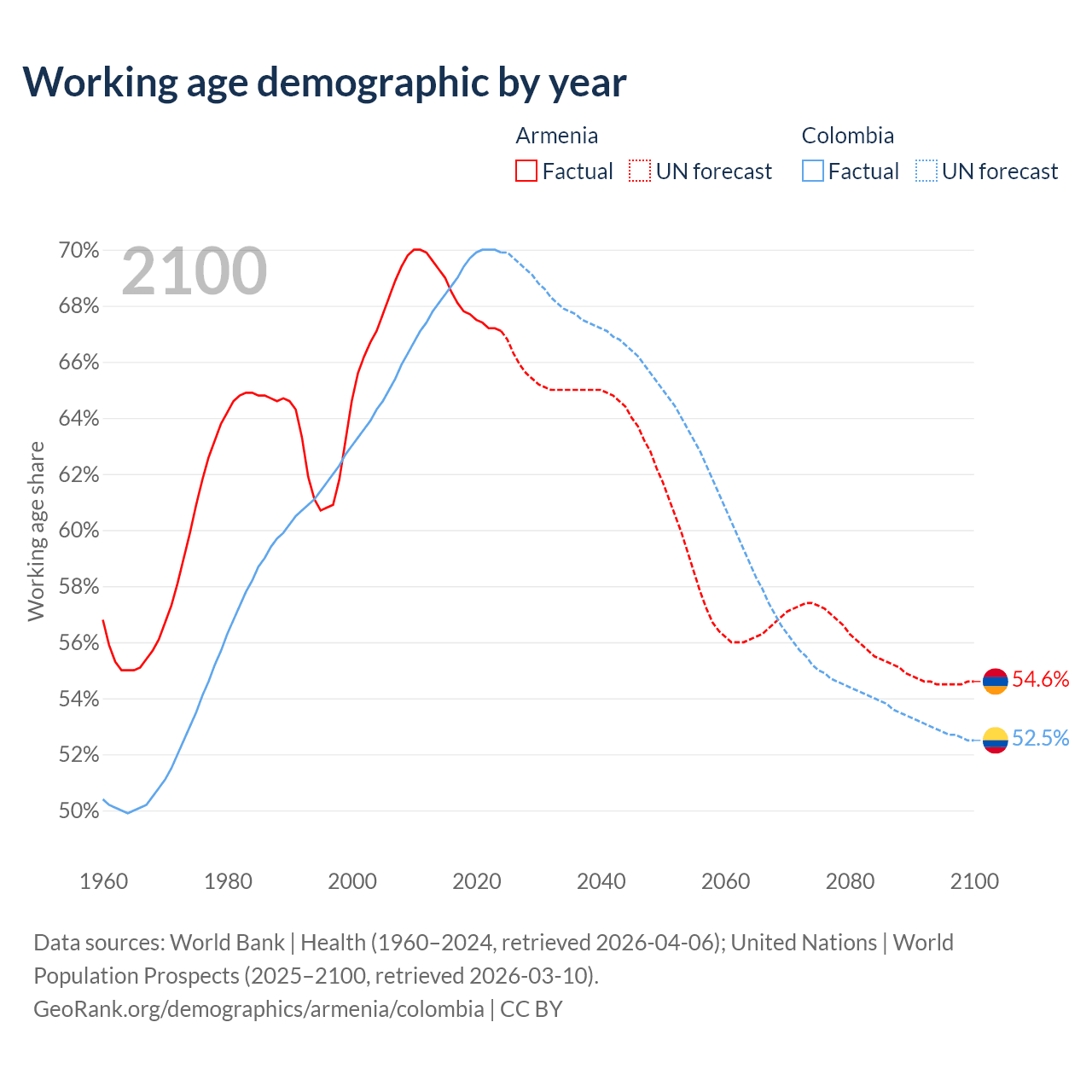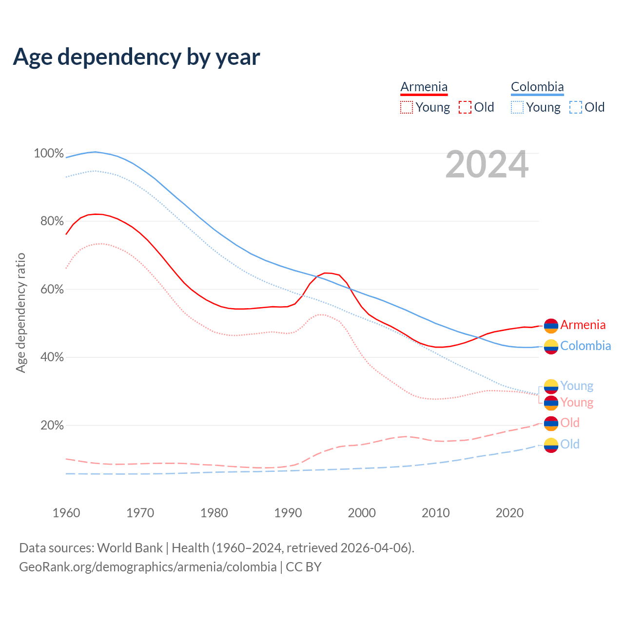 - Armenia is ranked 64/196 by median age (oldest to youngest) vs 89/196 for Colombia.