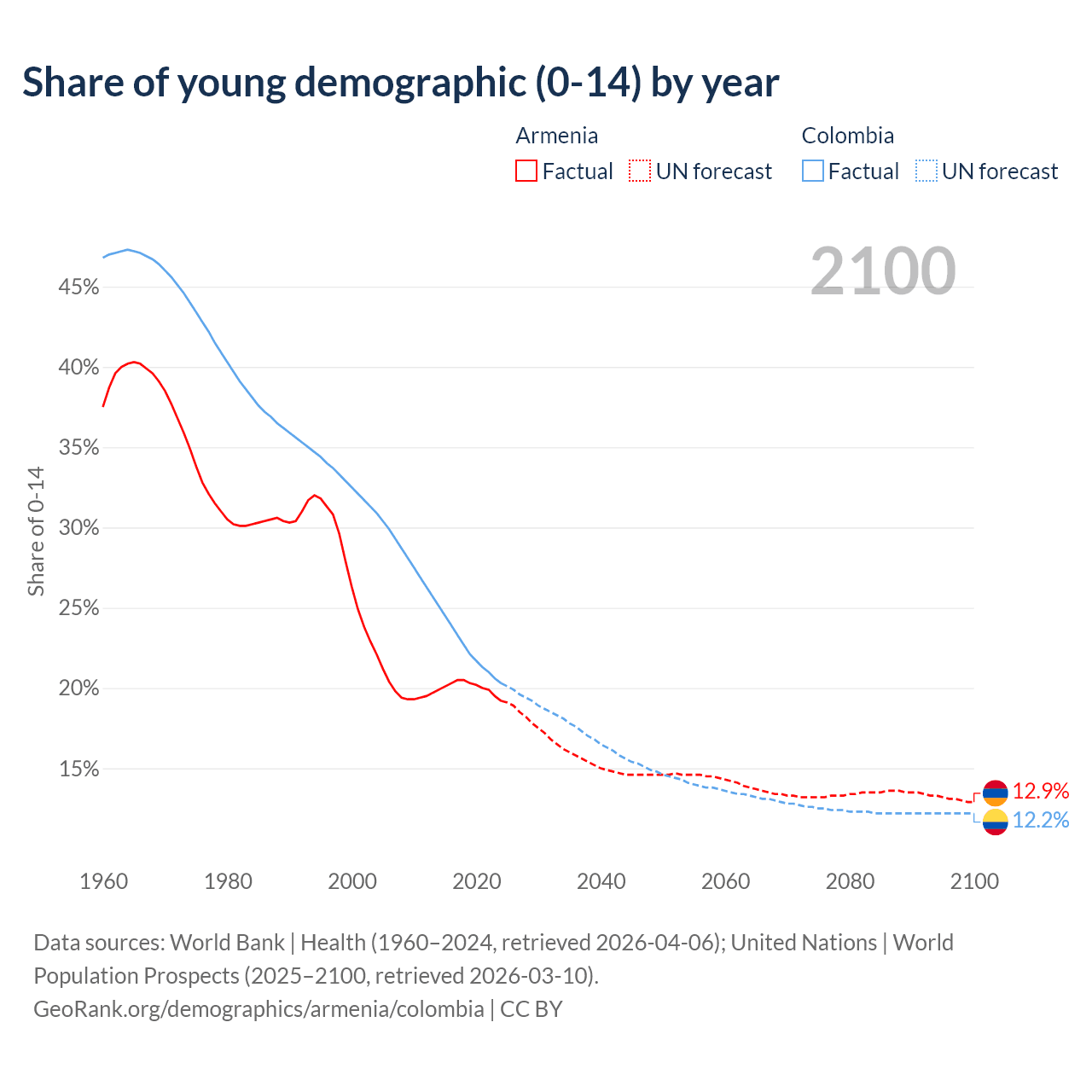 - The share of young demographic (0-15 years old) in Armenia is 19.2% vs 20.3% in Colombia.