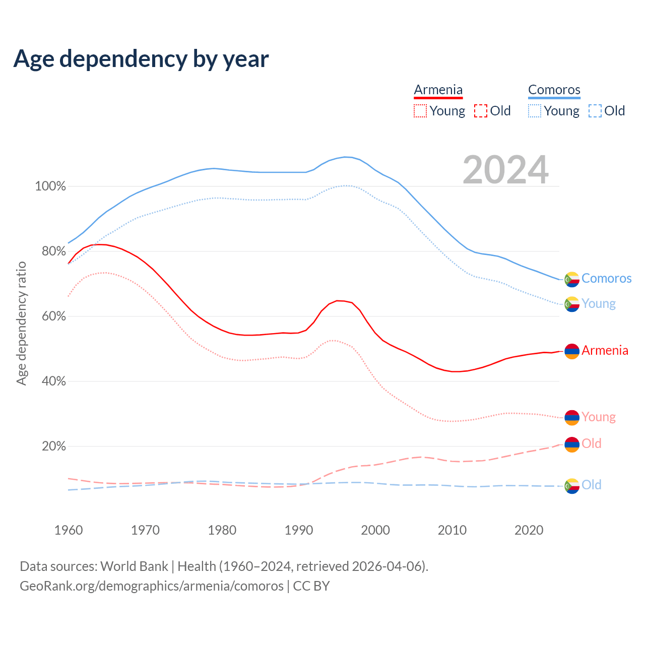 - The share of old-age demographic (65+) in Armenia is 13.7% vs 4.47% in Comoros.
