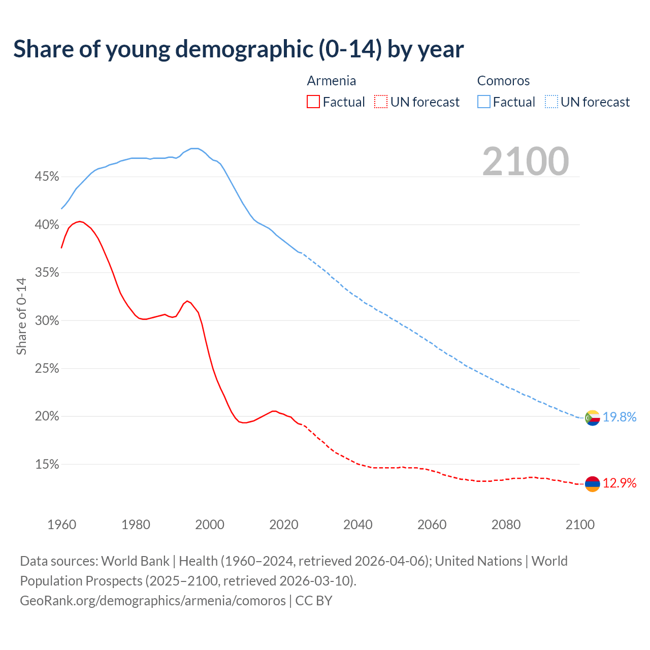 - The share of young demographic (0-15 years old) in Armenia is 19.2% vs 37.1% in Comoros.