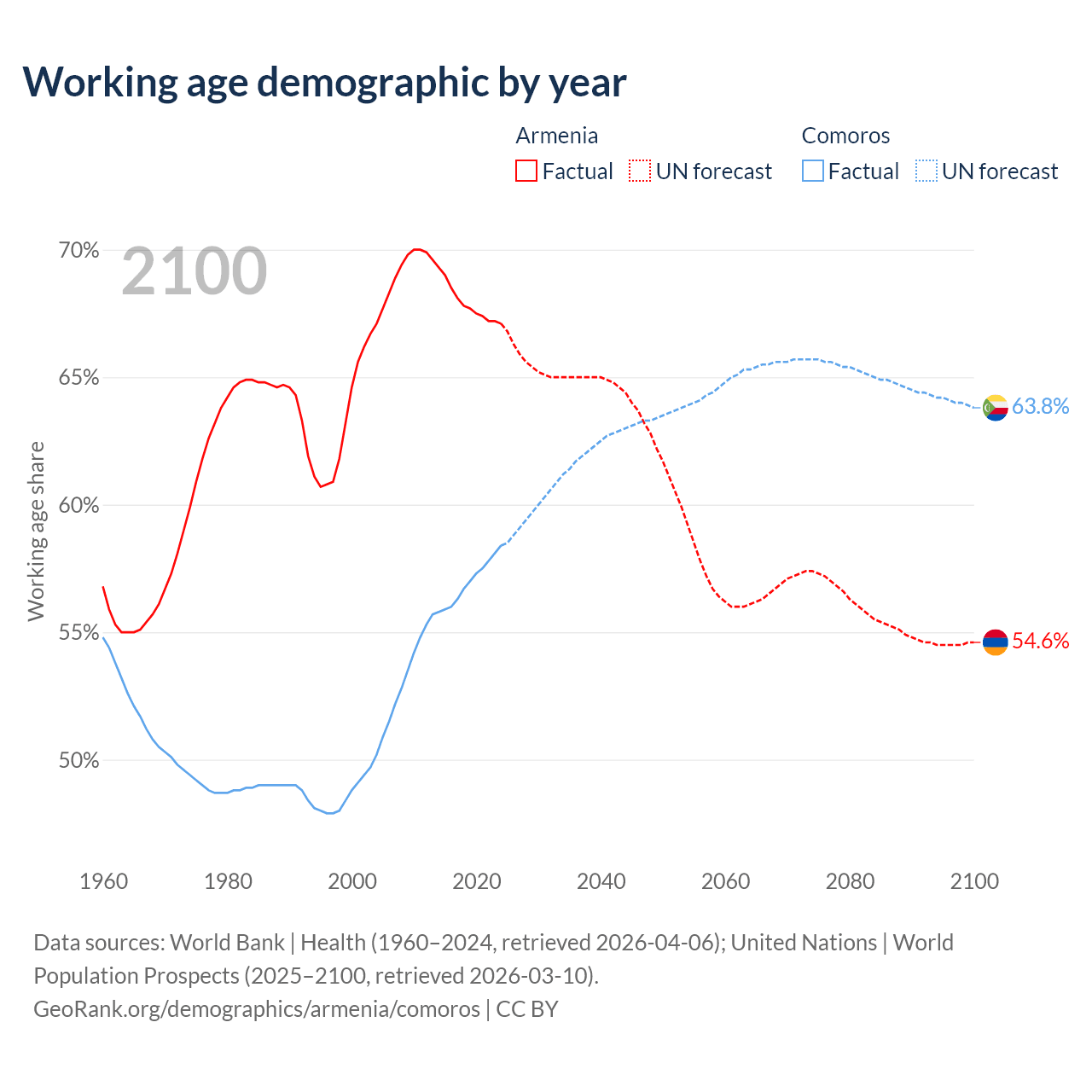 - Armenia has 2M working age adults (aged 15-64) vs 528K in Comoros.