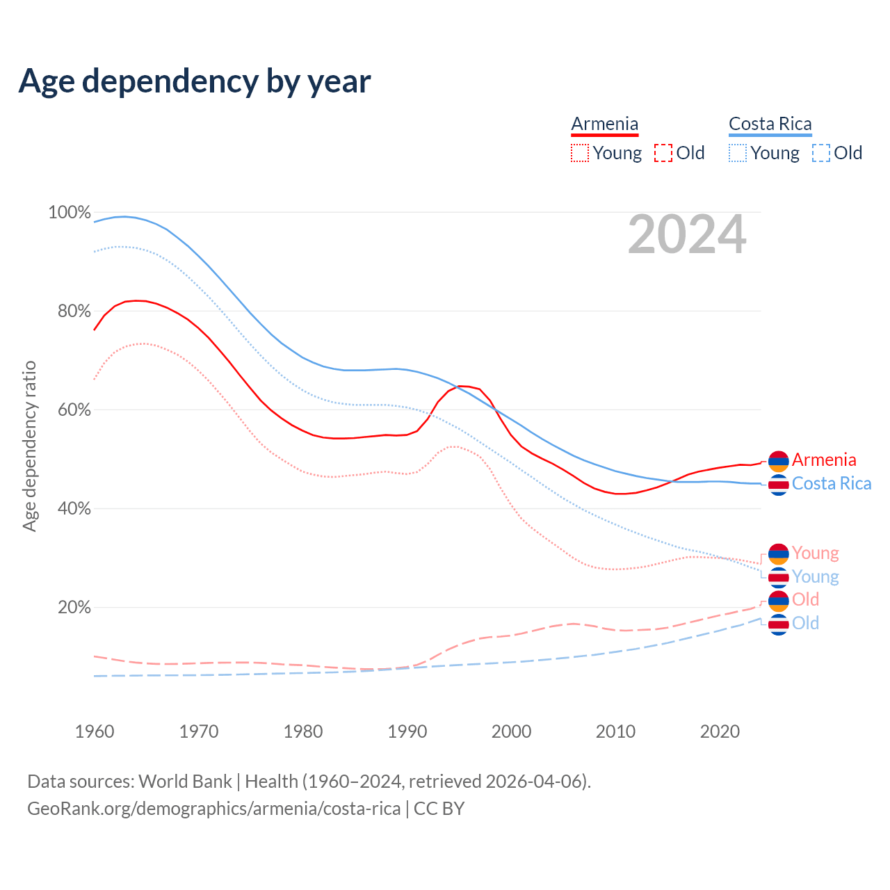 Data sources: World Bank | Health (1960–2024, retrieved 2026-04-06); U.S. Census Bureau (1960–2024, retrieved 2026-02-08).