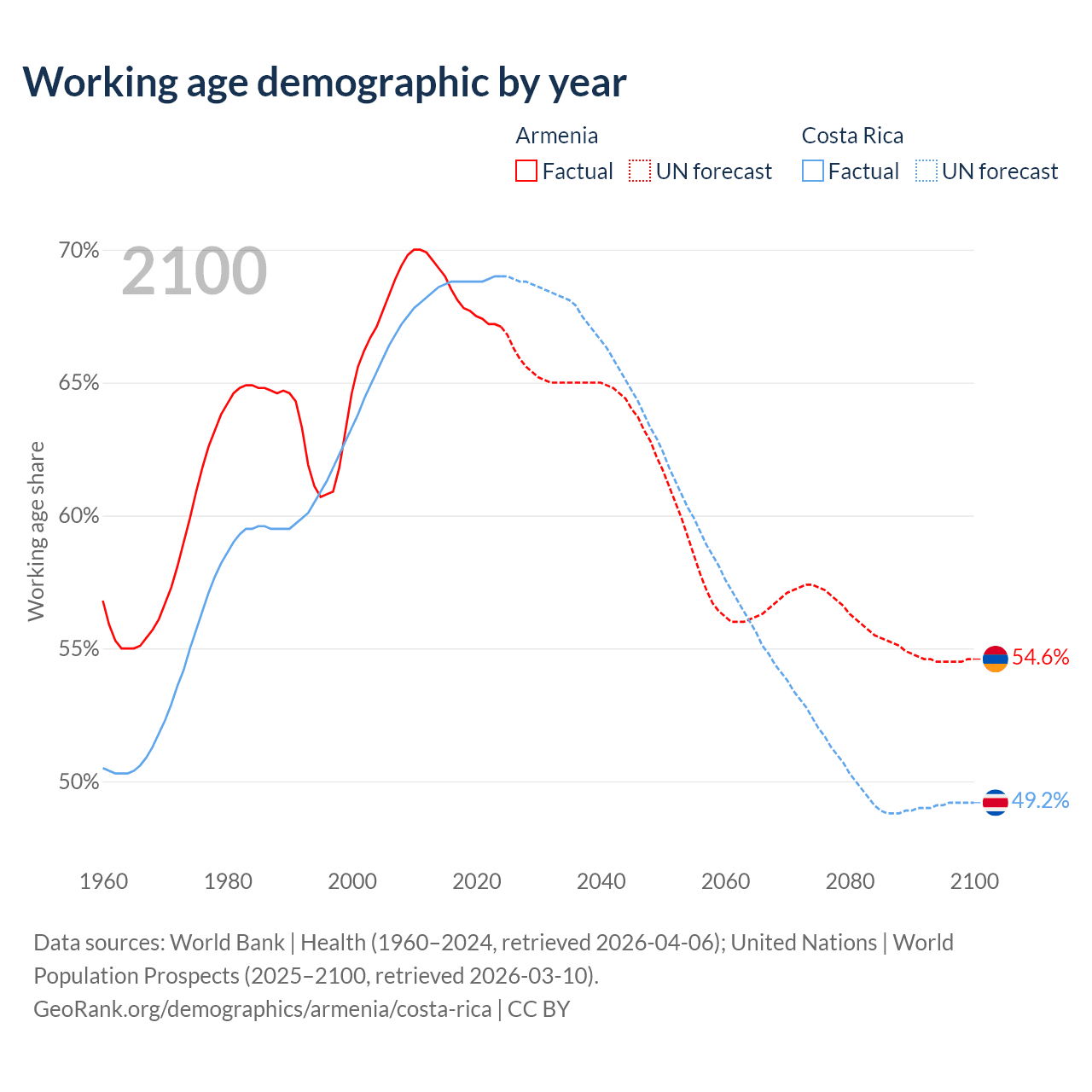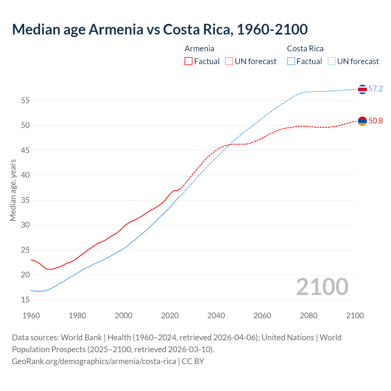 Median age Armenia vs Costa Rica, 1960-2100
