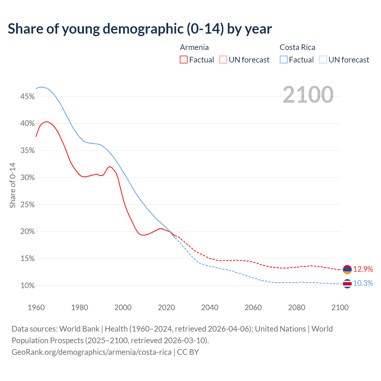 - The share of young demographic (0-15 years old) in Armenia is 19.2% vs 18.8% in Costa Rica.