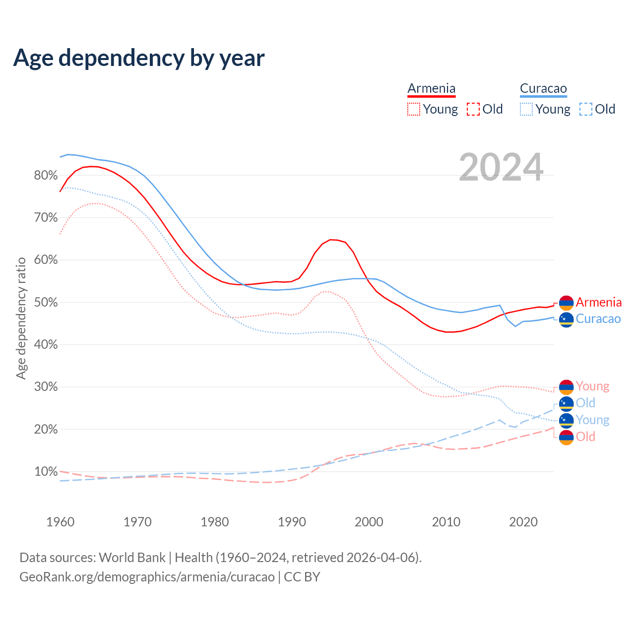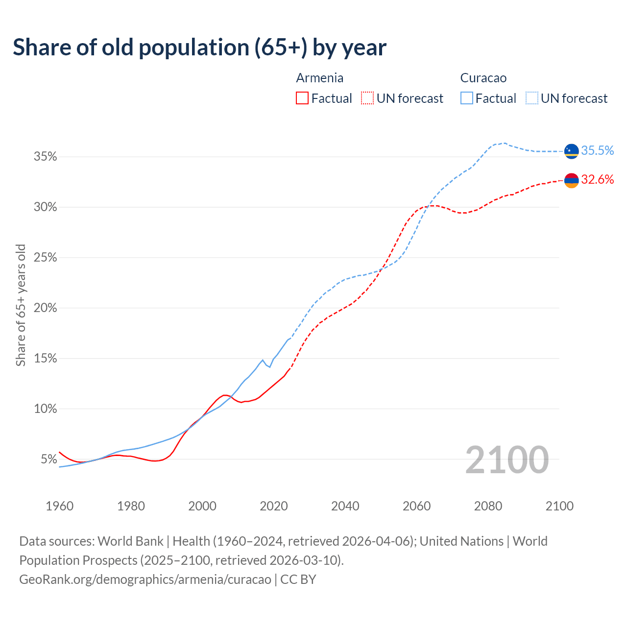 - The share of old-age demographic (65+) in Armenia is 13.7% vs 16.8% in Curacao.