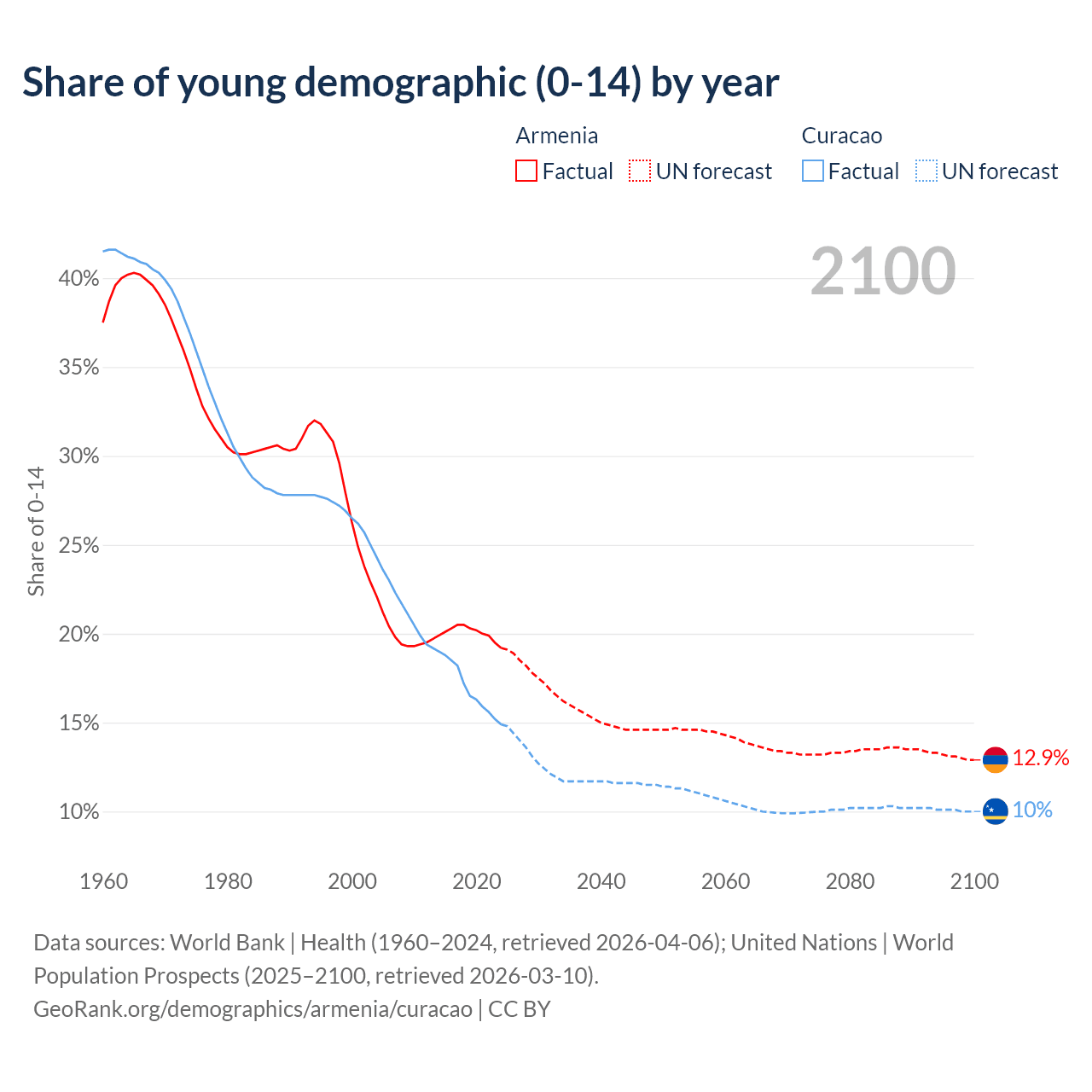- The share of young demographic (0-15 years old) in Armenia is 19.2% vs 14.9% in Curacao.