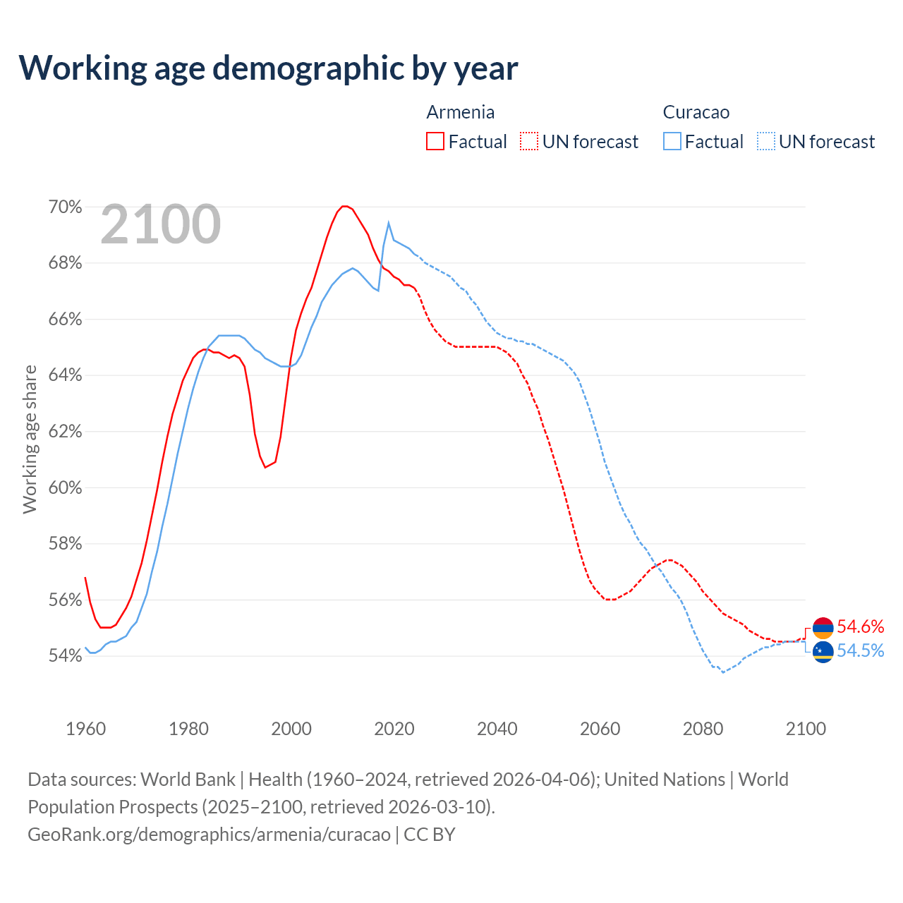 Median age Armenia vs Curacao, 1960-2100