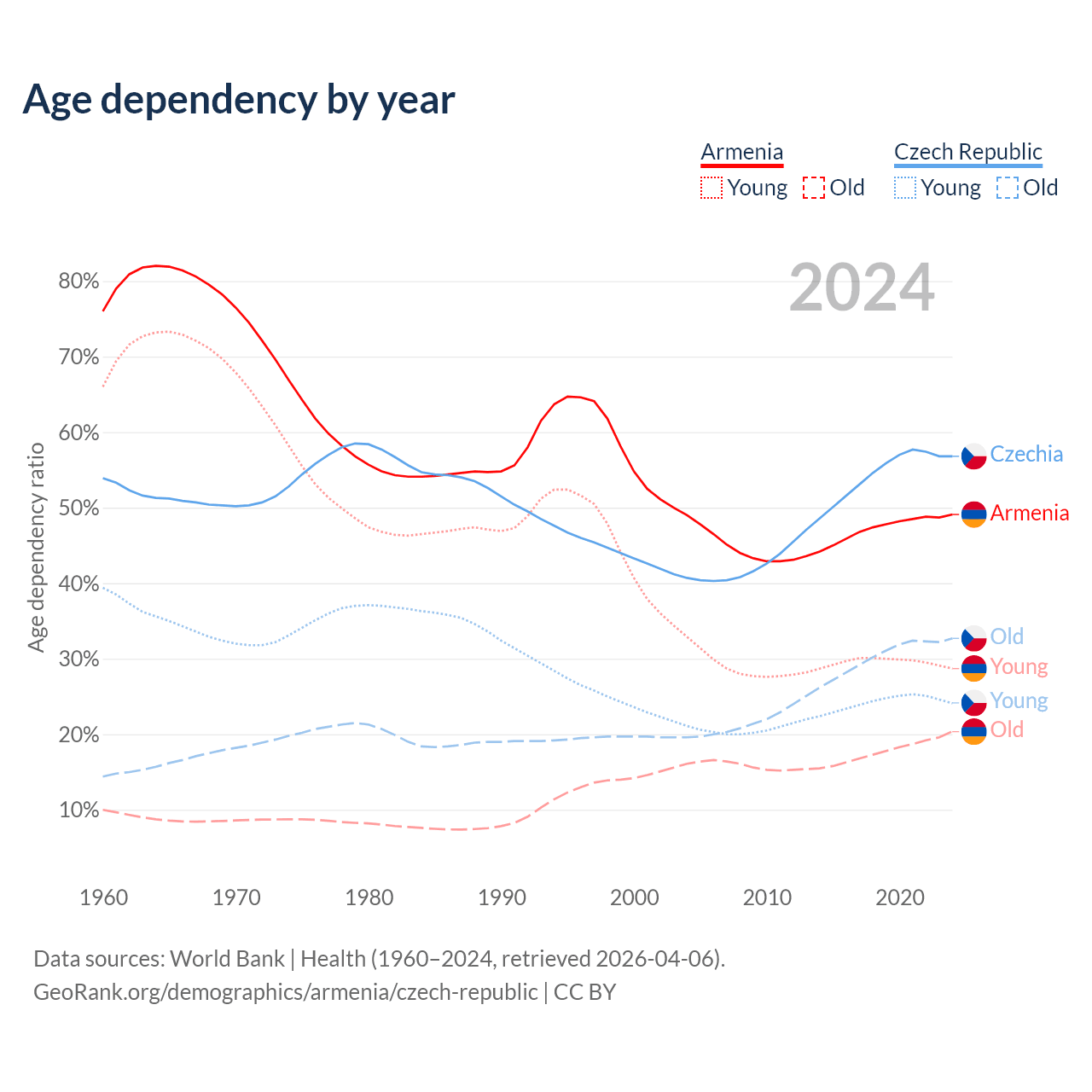 The share of older people aged 65 and over is 13.7% in Armenia and 20.8% in the Czech Republic. Life expectancy in Armenia compared to the Czech Republic .