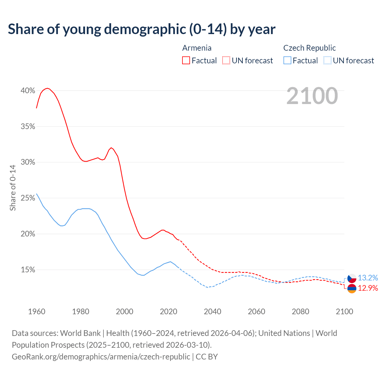 - The share of young demographic (0-15 years old) in Armenia is 19.2% vs 15.4% in the Czech Republic.