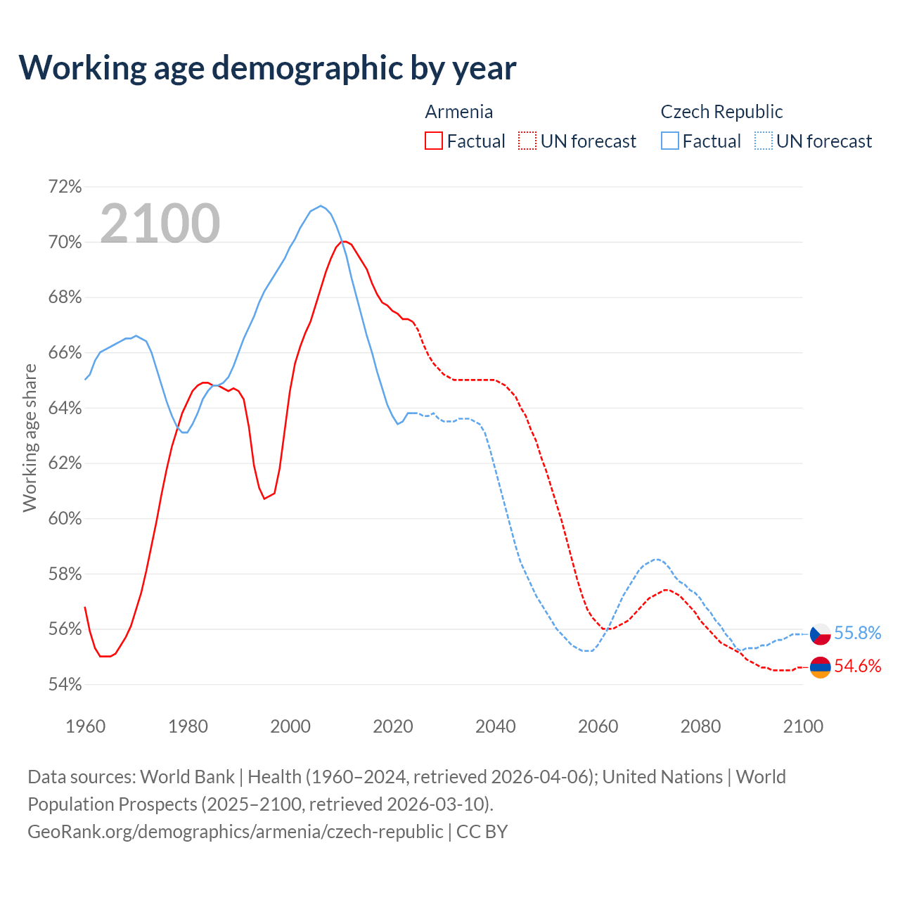 Median age Armenia vs Czech Republic, 1960-2100
