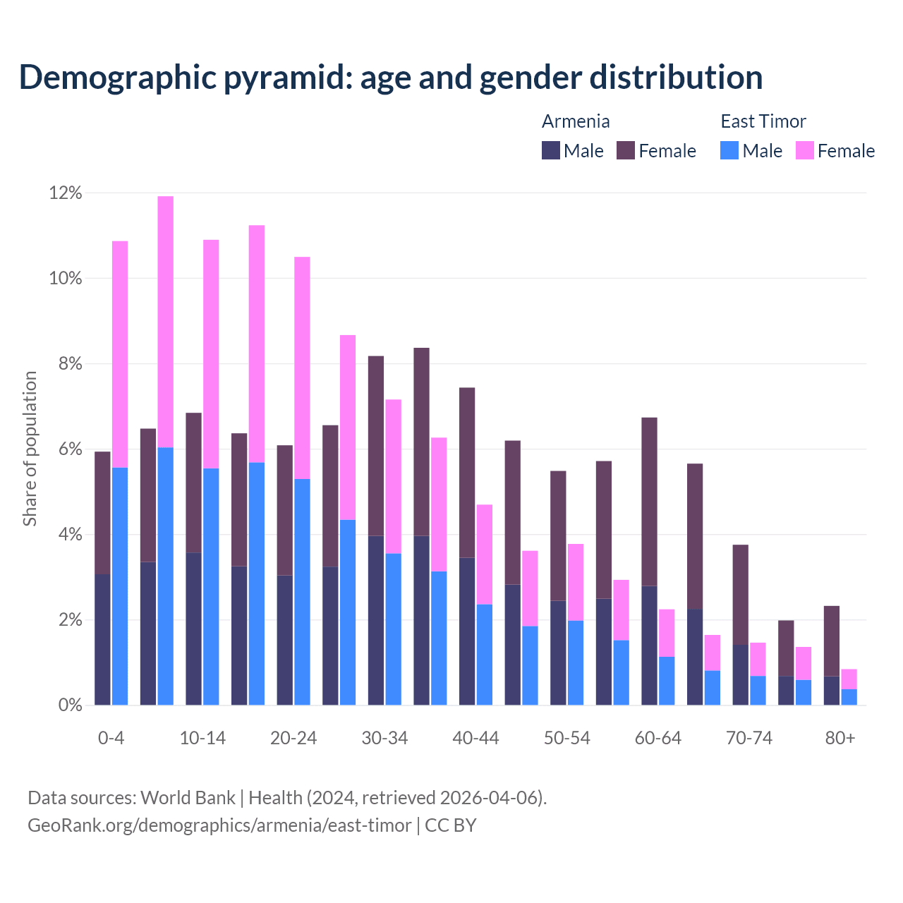 - Armenia is ranked 64/196 by median age (oldest to youngest) vs 145/196 for East Timor.