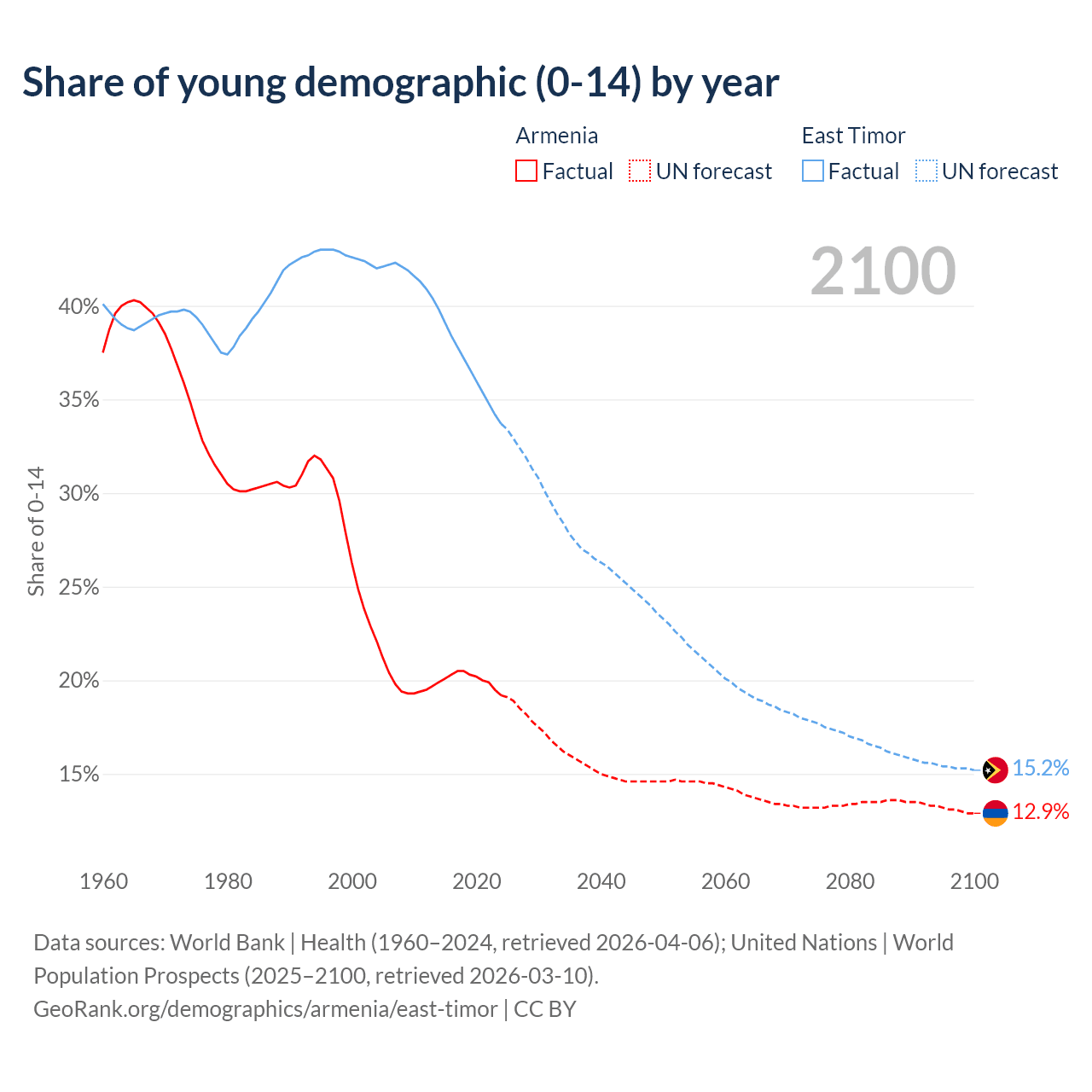 - The share of young demographic (0-15 years old) in Armenia is 19.2% vs 33.7% in East Timor.