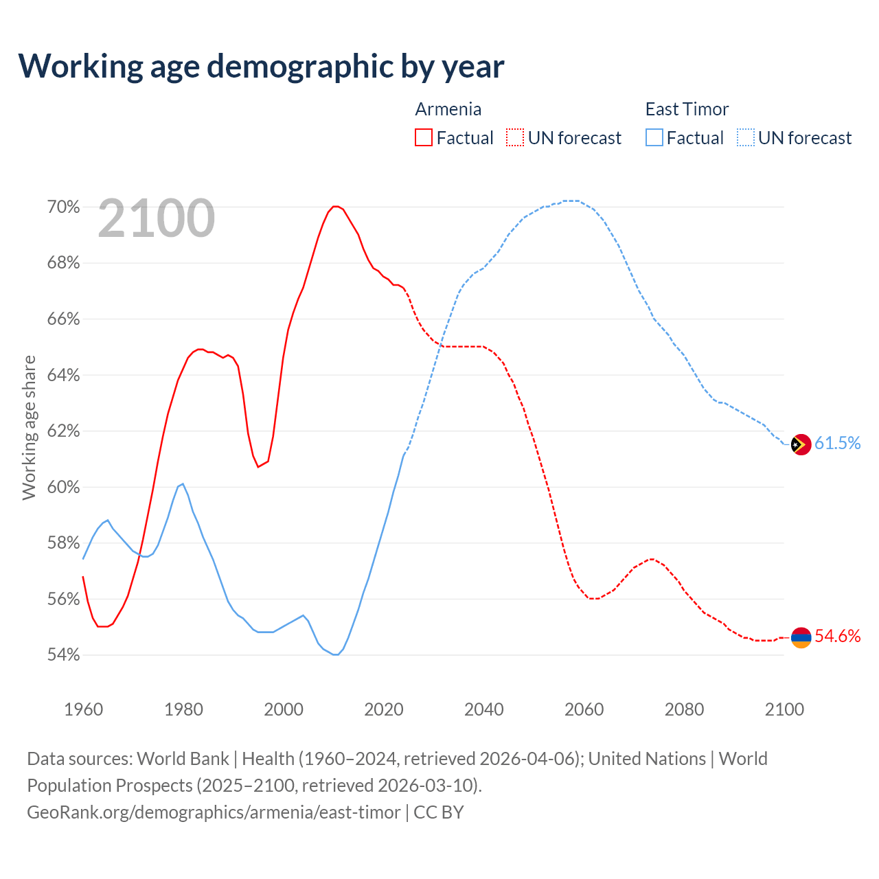 - Armenia has 2M working age adults (aged 15-64) vs 880K in East Timor.