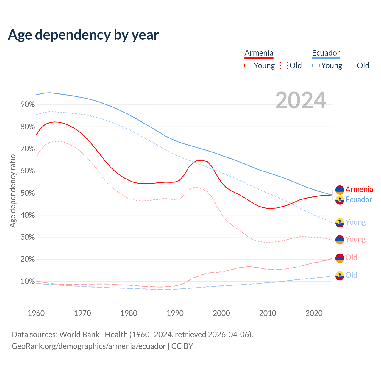 The share of older people aged 65 and over is 13.7% in Armenia and 8.34% in Ecuador. Life expectancy in Armenia compared to Ecuador .