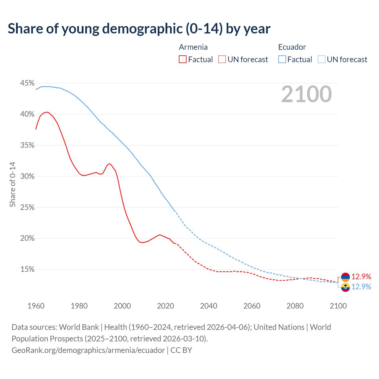 - The share of young demographic (0-15 years old) in Armenia is 19.2% vs 24.5% in Ecuador.