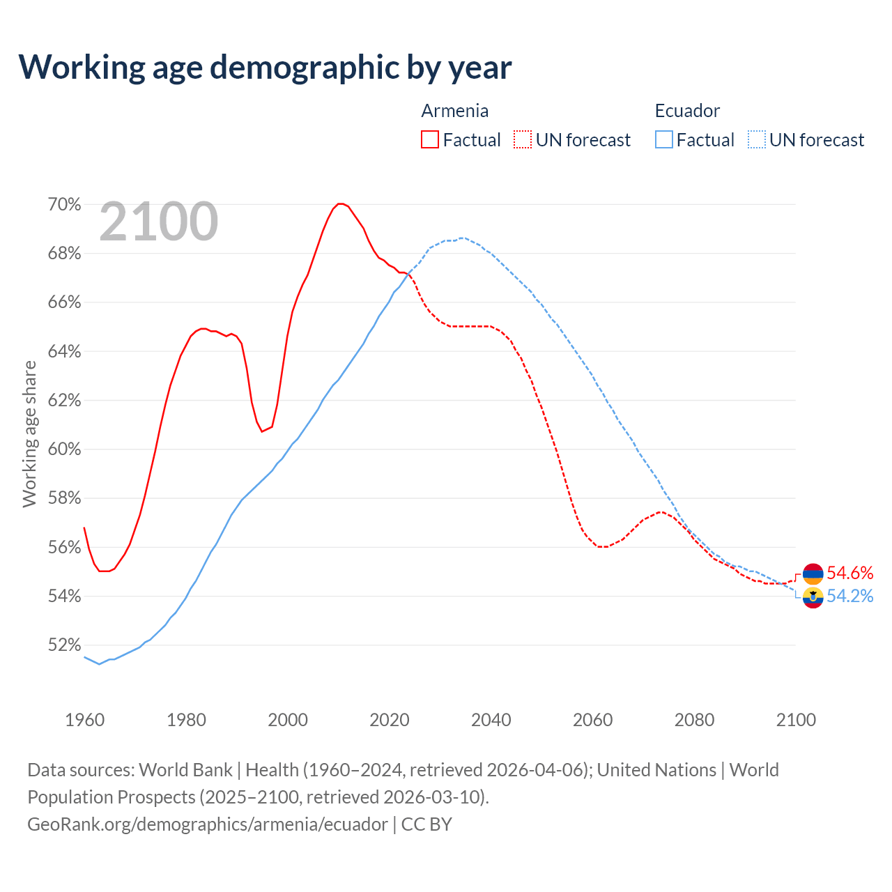 - Armenia has 2M working age adults (aged 15-64) vs 12.4M in Ecuador.