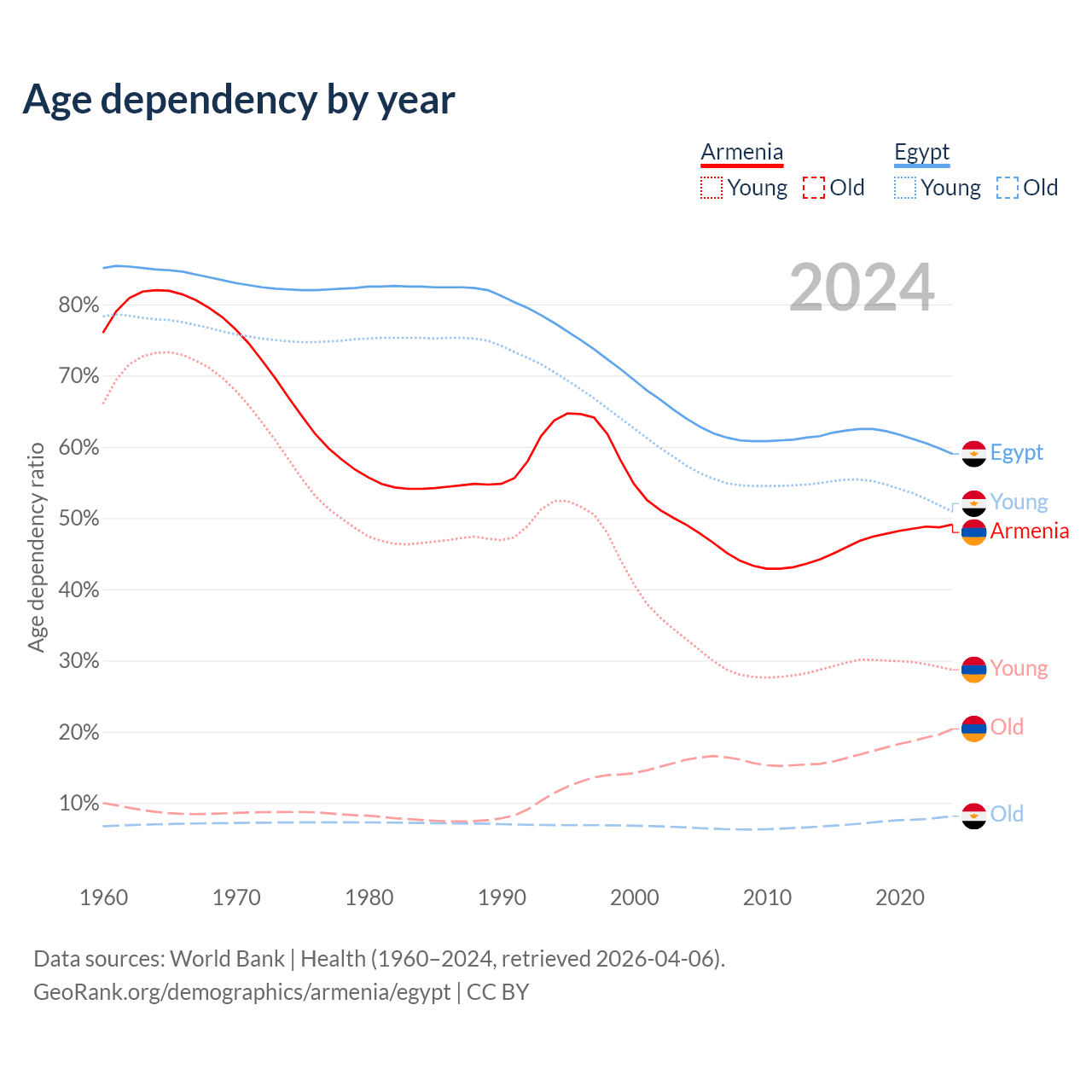 - Armenia is ranked 64/196 by median age (oldest to youngest) vs 133/196 for Egypt.