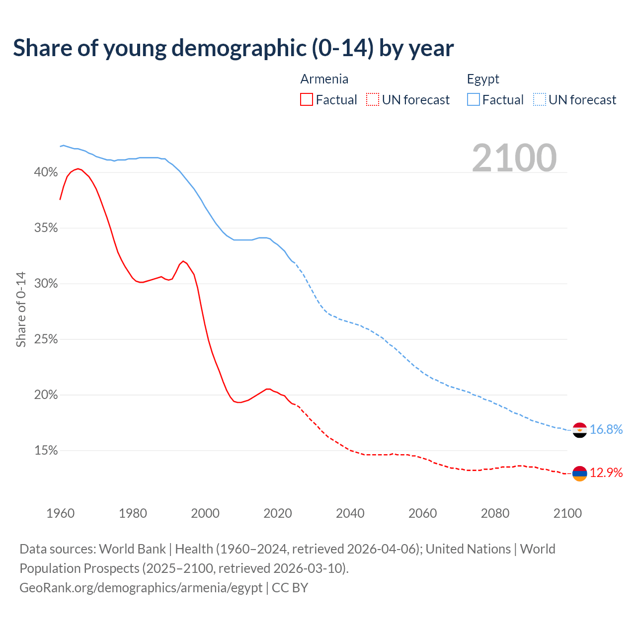 - The share of young demographic (0-15 years old) in Armenia is 19.2% vs 32% in Egypt.