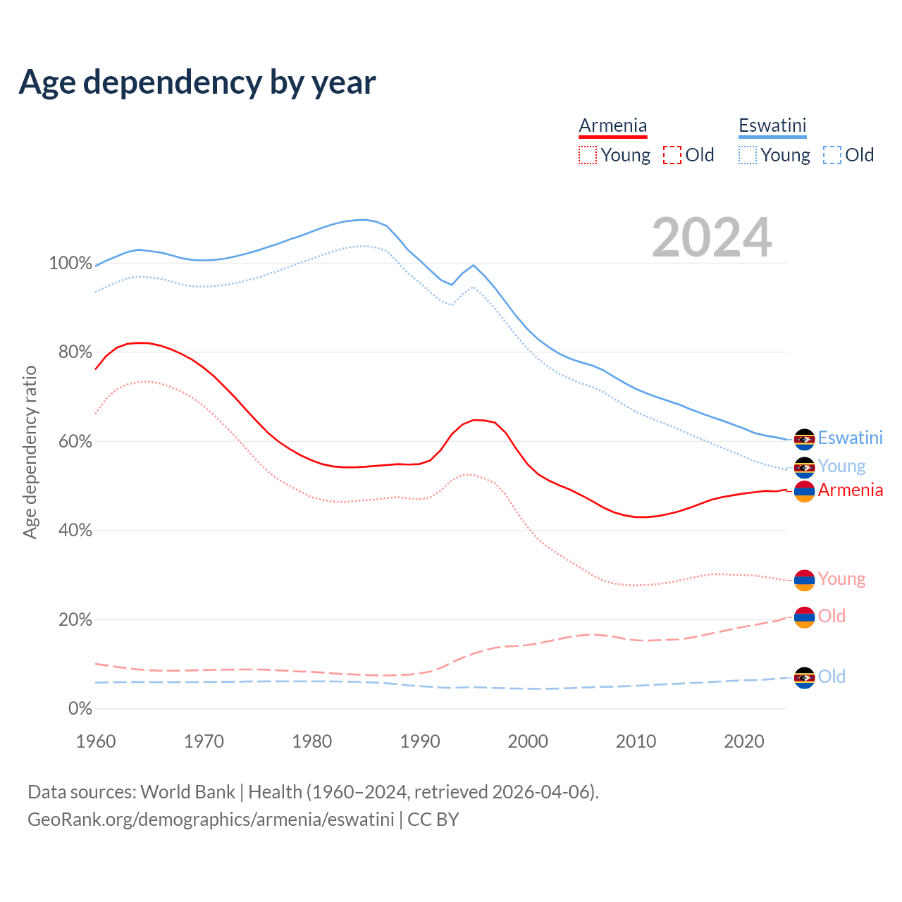 - The share of old-age demographic (65+) in Armenia is 13.7% vs 4.26% in Eswatini.
