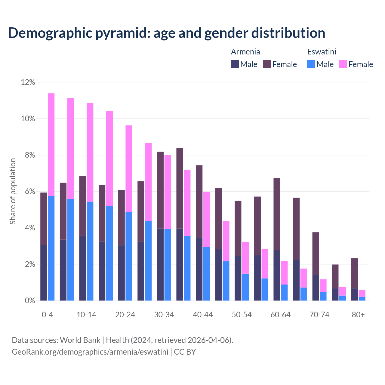 The share of older people aged 65 and over is 13.7% in Armenia and 4.26% in Eswatini. Life expectancy in Armenia compared to Eswatini .