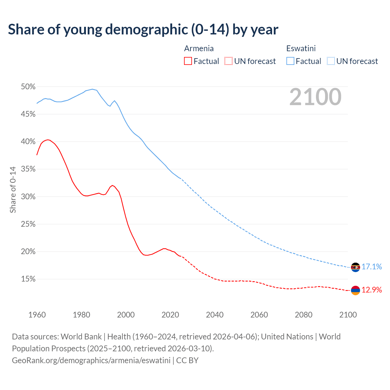 - The share of young demographic (0-15 years old) in Armenia is 19.2% vs 33.4% in Eswatini.