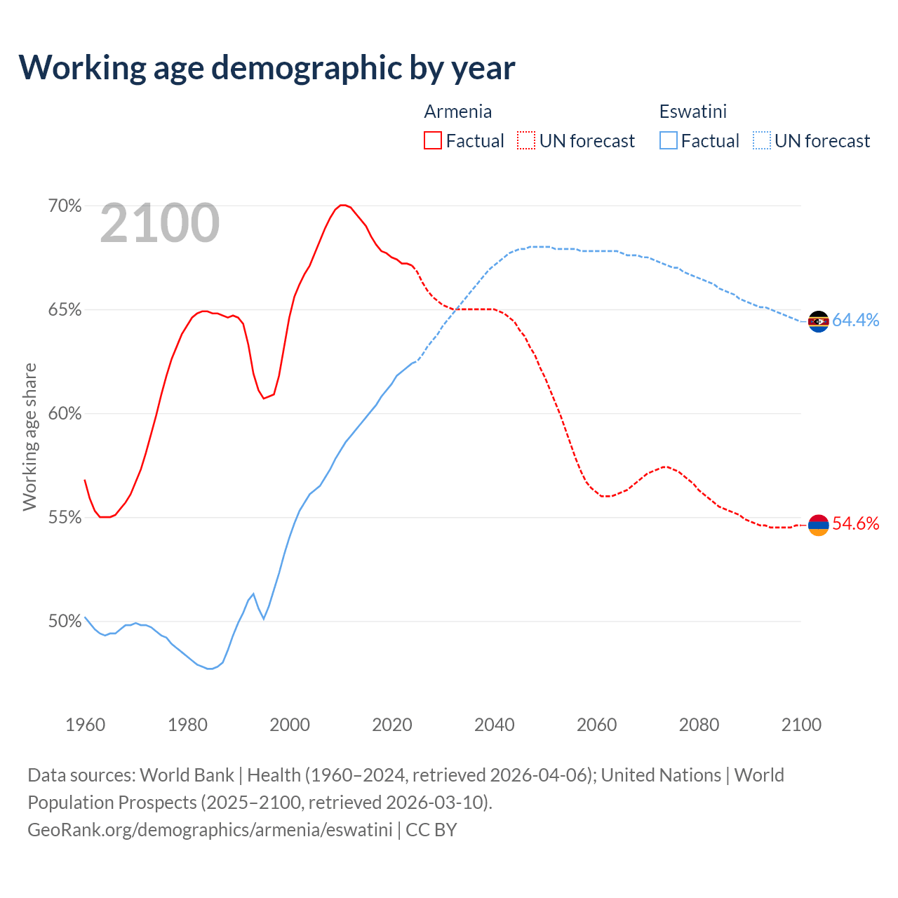 - Armenia has 2M working age adults (aged 15-64) vs 794K in Eswatini.